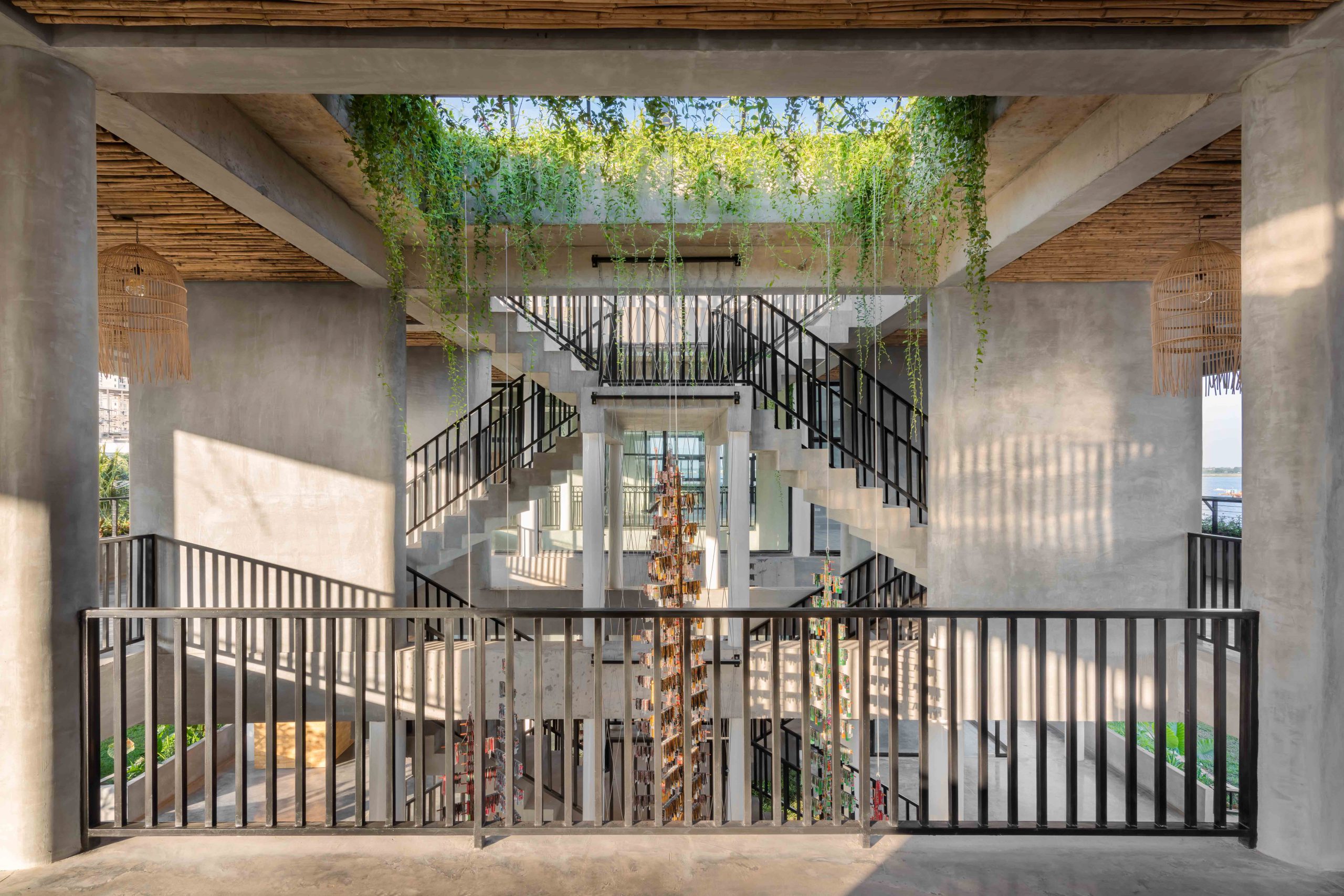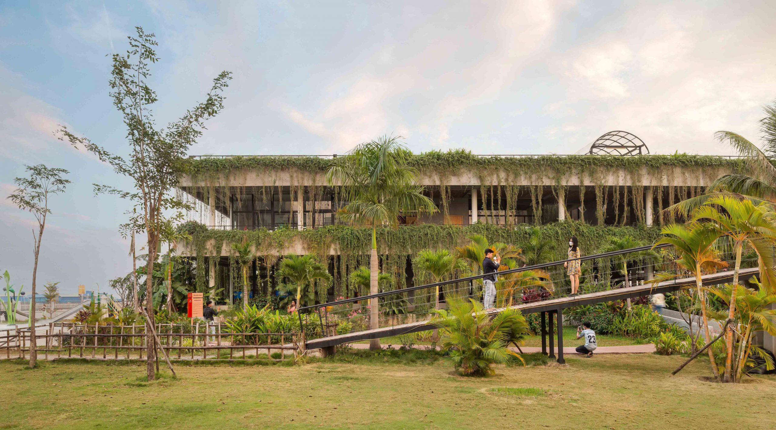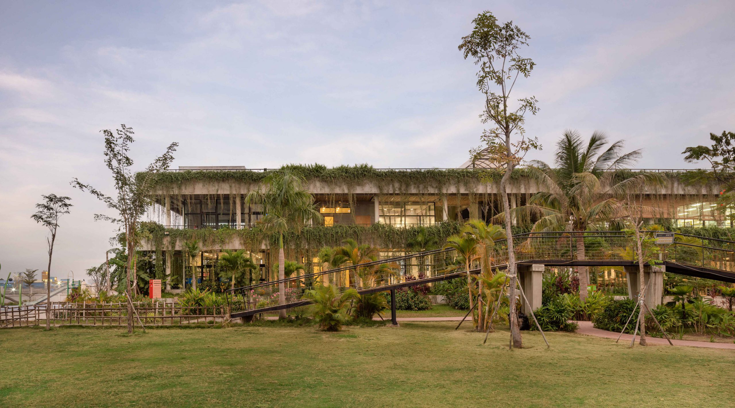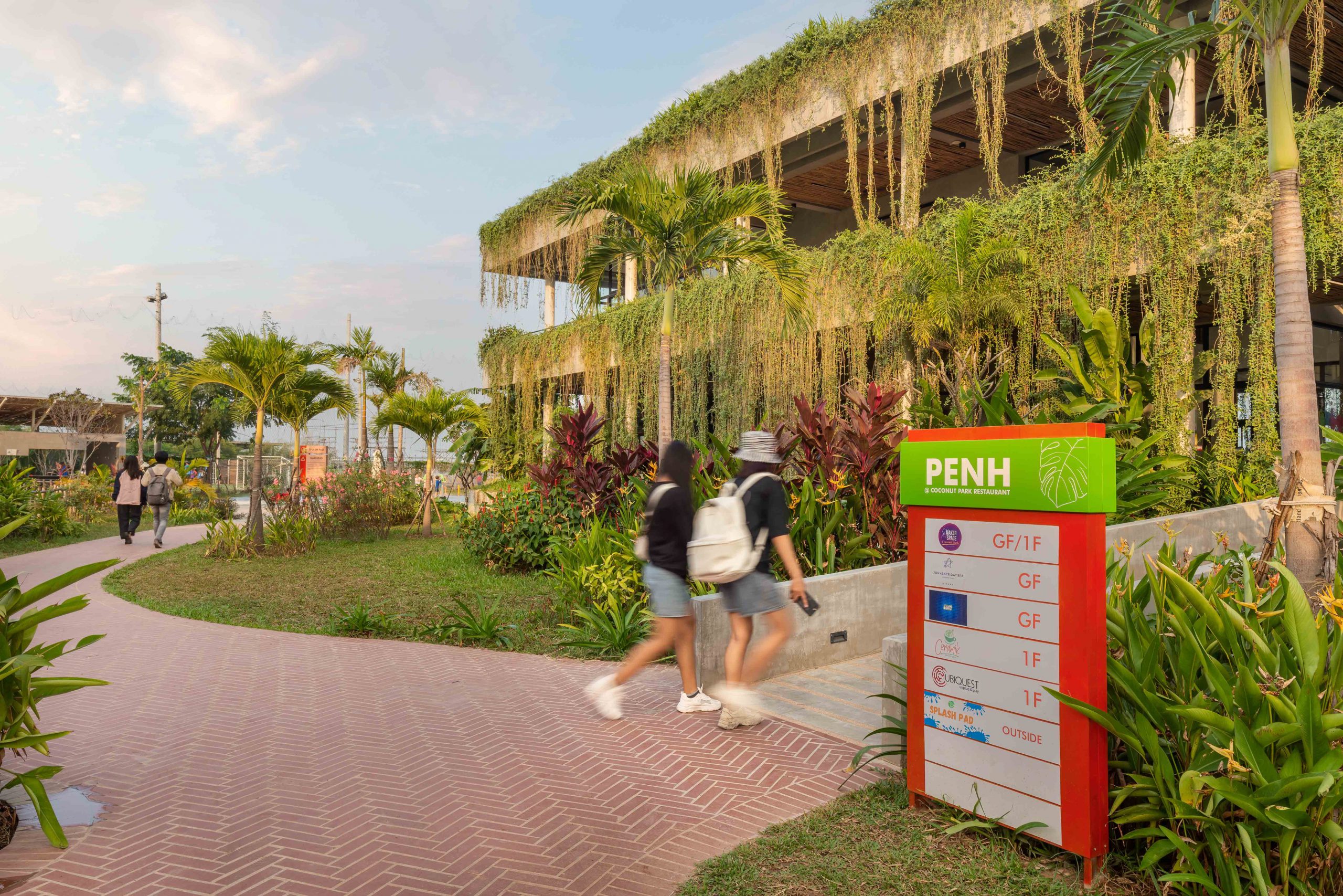 T3 ARCHITECTS designed the Master Plan of the Coconut Club Recreational Park of Phnom Penh dedicated to kids, teenagers and families. T3 also designed the main building proposing different activities around hospitality, entertainment and wellness: organic restaurant, river view bar, spa, kids club, event area. All around the building, the idea is to create outdoor activities like bicycle tour, water games area, slides through tropical plants, observation tower… Of course, T3 design follows bioclimatic principles to avoid the use of air conditioning (except some specific areas like spa and meeting room) with a building located between the riverfront and a lush tropical garden, increasing cross ventilation. Sun protection and overhangs have been tailor-made to optimize the control of natural light and heat, both to improve customers comfort and reduce energy consumption. This building is also a nice manifesto of a smart biophilic architecture, bringing nature around and into the building, but without increasing the structure of the building, as most of the plants and trees directly grow into the natural soil around the building. The maintenance is easy and the plants can develop easily without complicated irrigation system; Low tech solutions are very often the best on long term perspective! The Coconut Club is already a famous place to relax for People from Phnom Penh, especially families and kids!