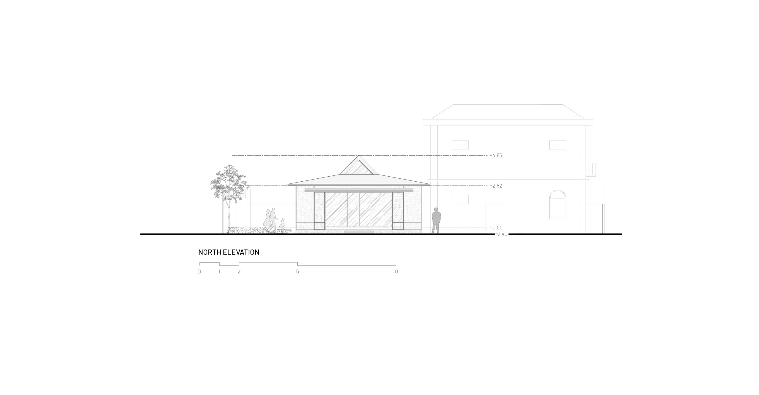 As the existing Villa will be rented as part of the Dojo office and as a co-working space for Judo practitioners T3 decided to do the main circulation through the existing building where a new changing room is placed. Moreover, we decided to relocate the main entrance creating a new gate in the alley next to the plot avoiding the access from an existing dangerous road junction.