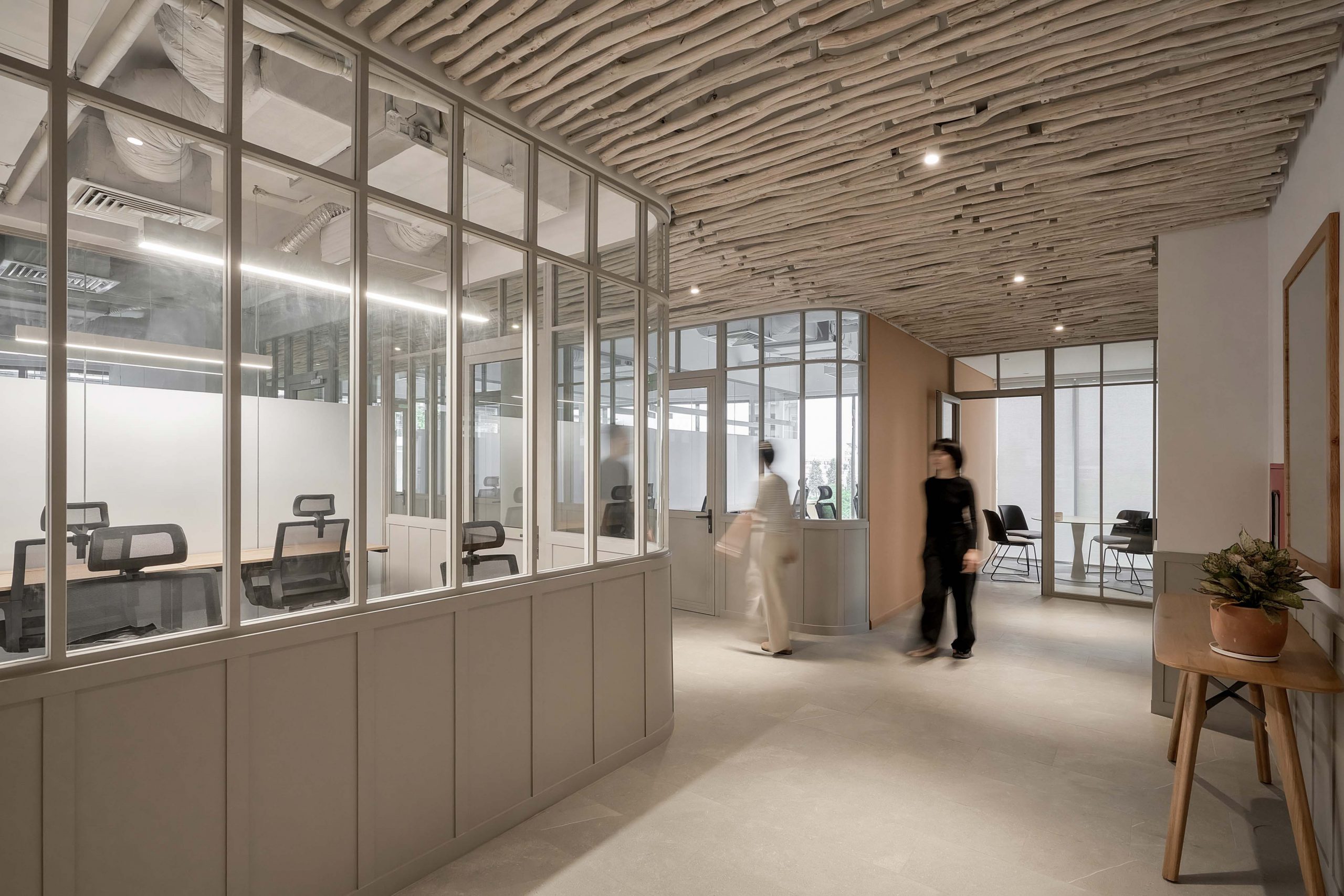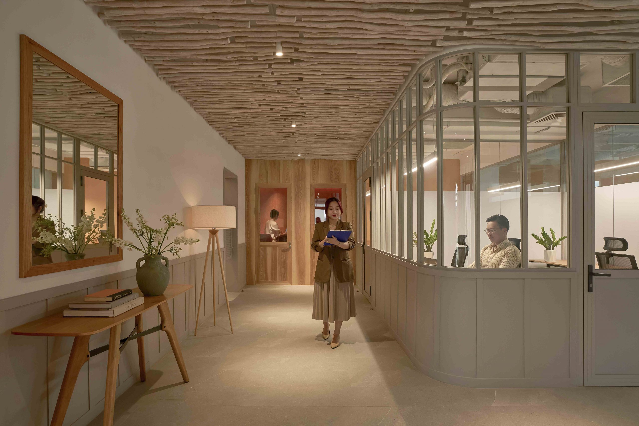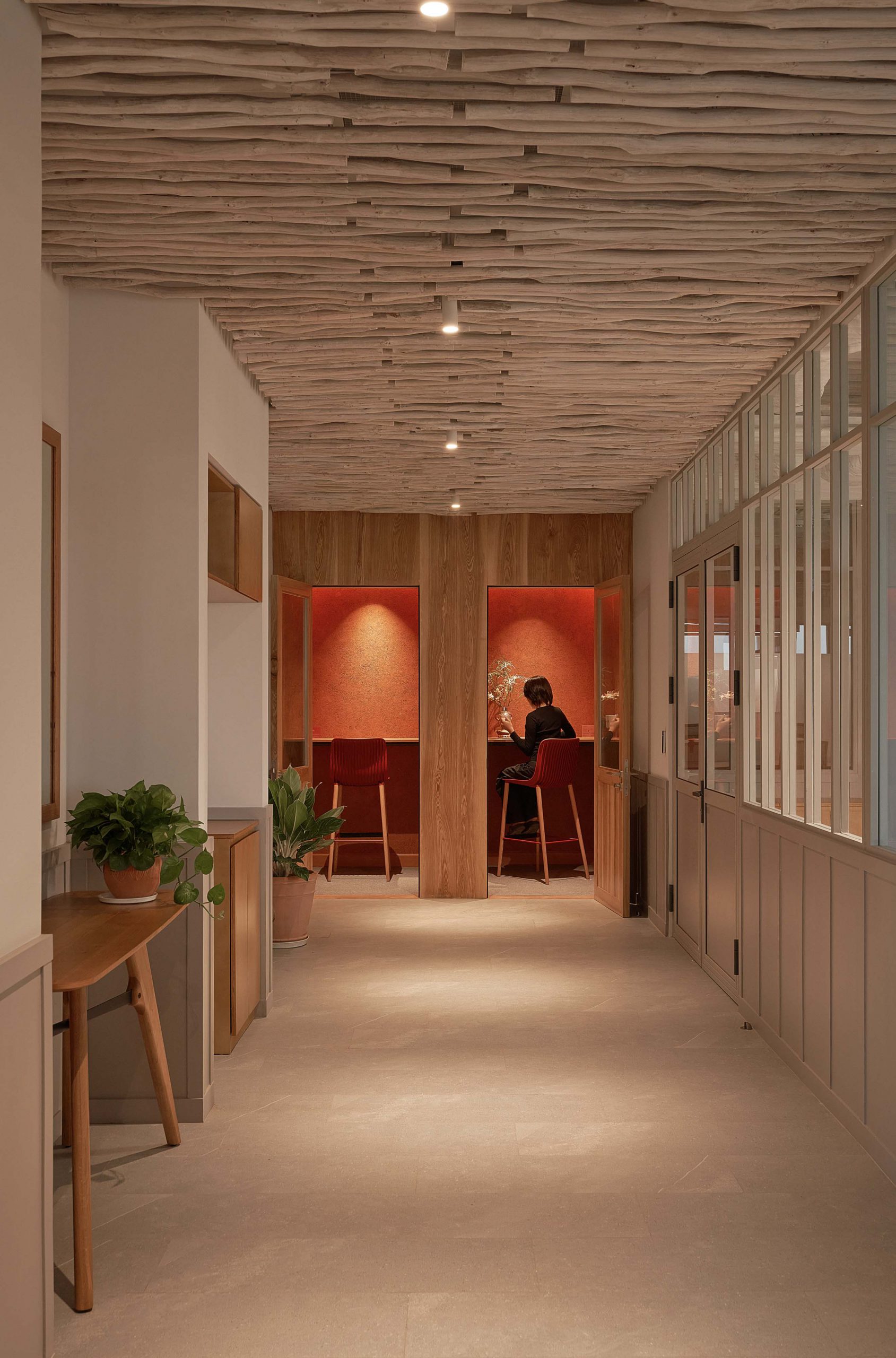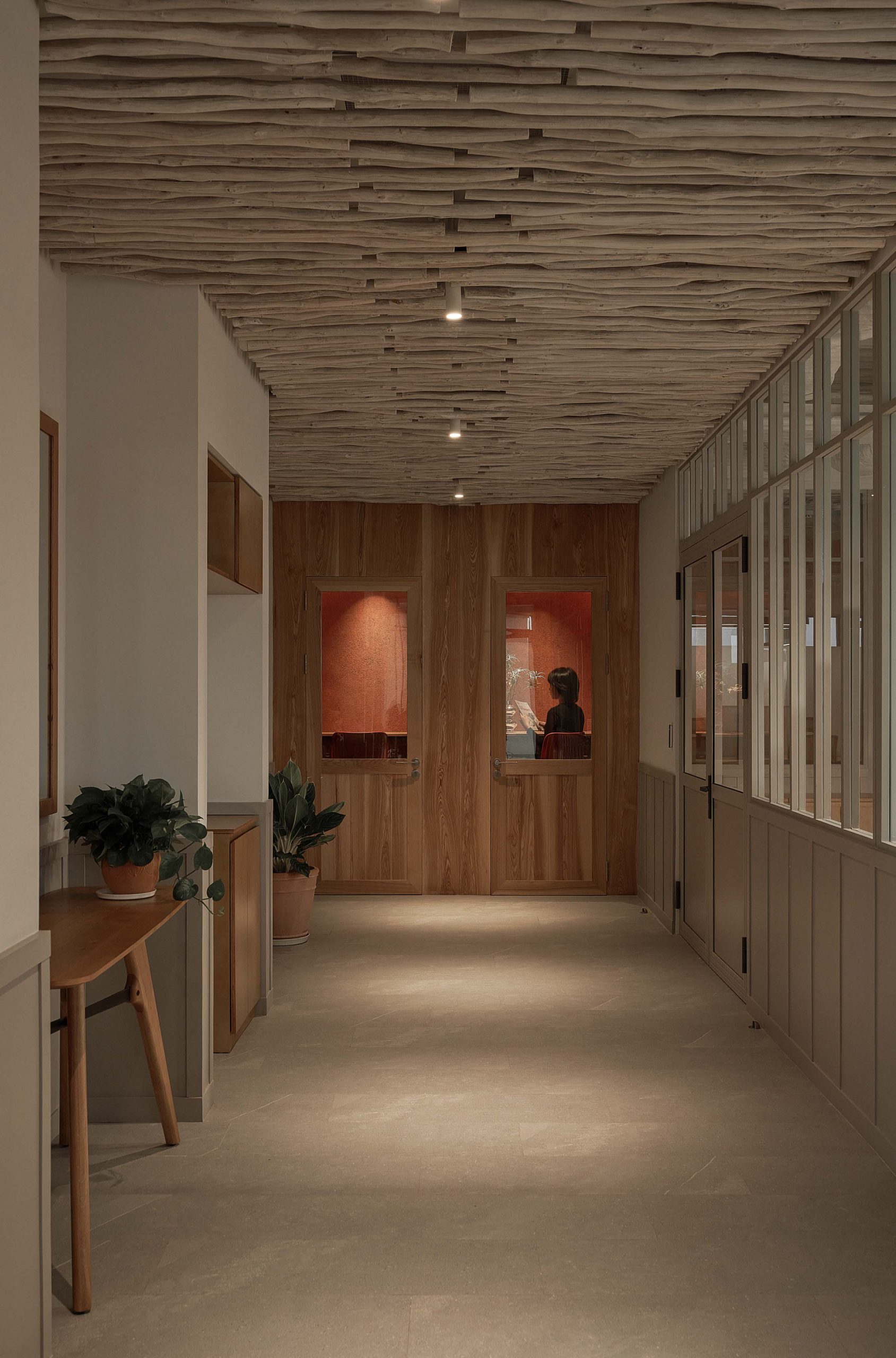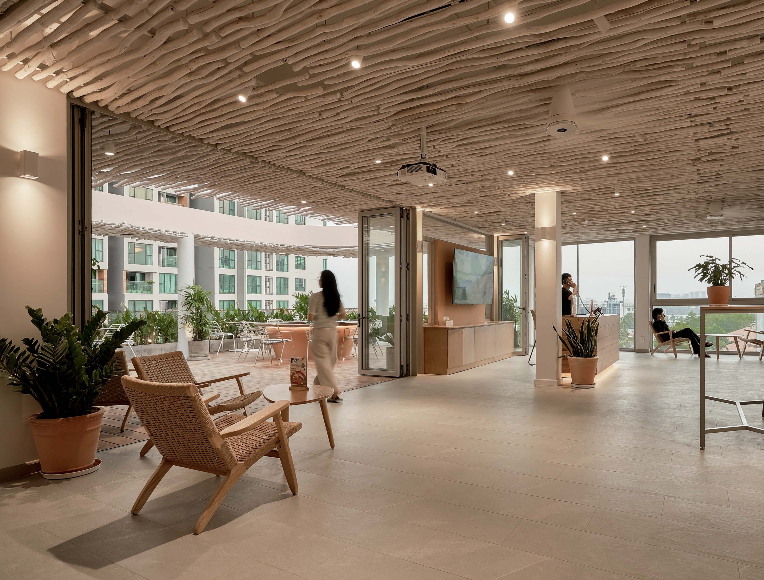 Bringing inspiration from natural and less chemical materials, the wavy ceiling using Vietnamese Melaleuca timber, and the clay color palette create a sense of intimacy and maturity while maintaining a relaxed and informal ambiance.