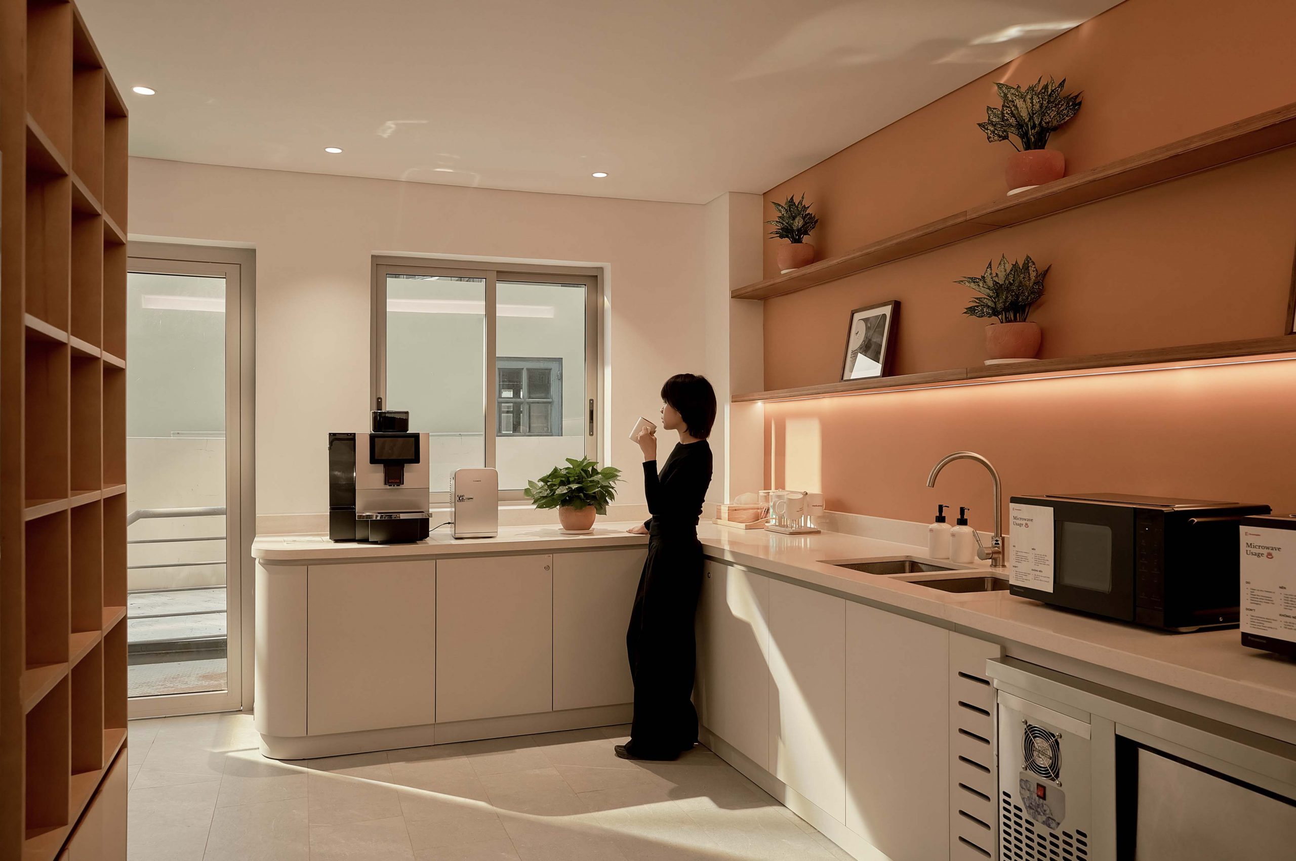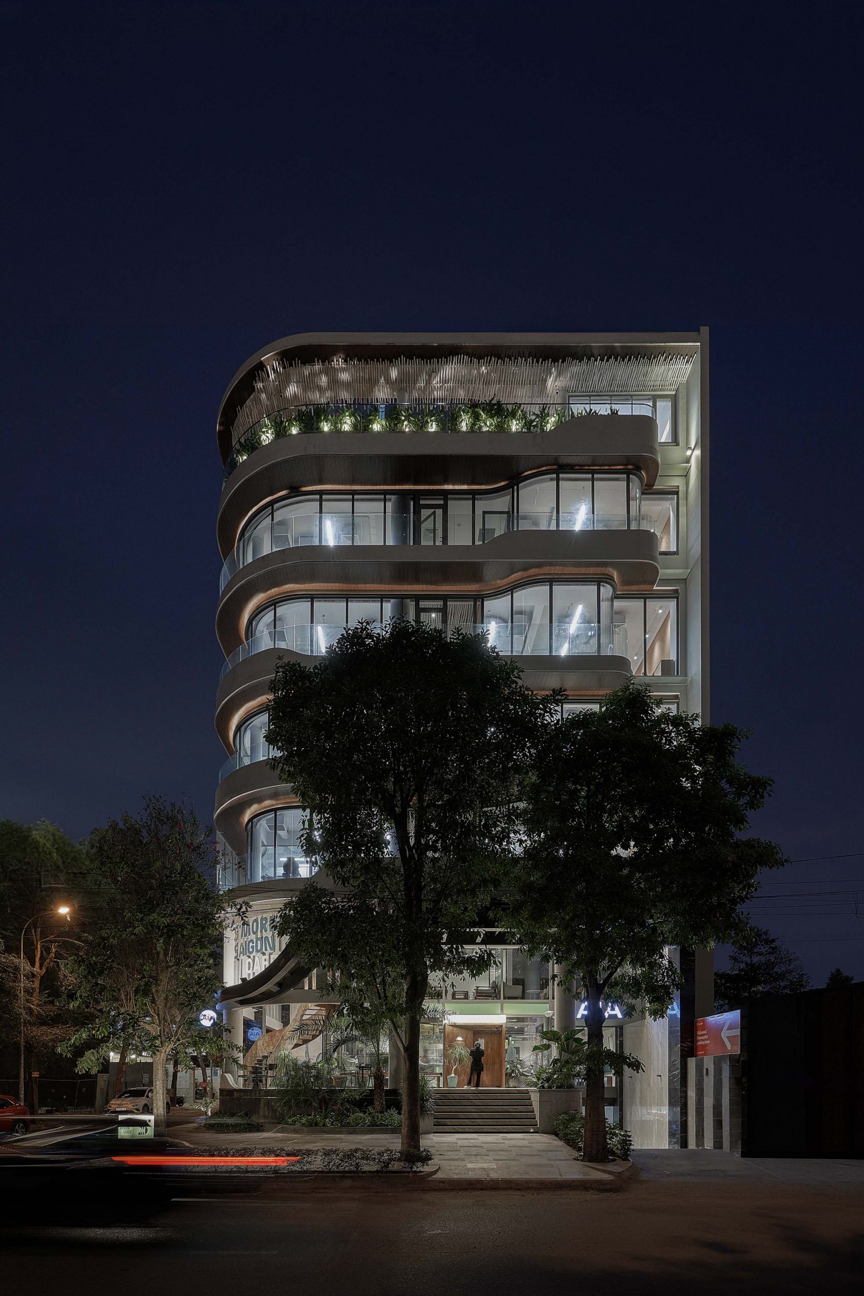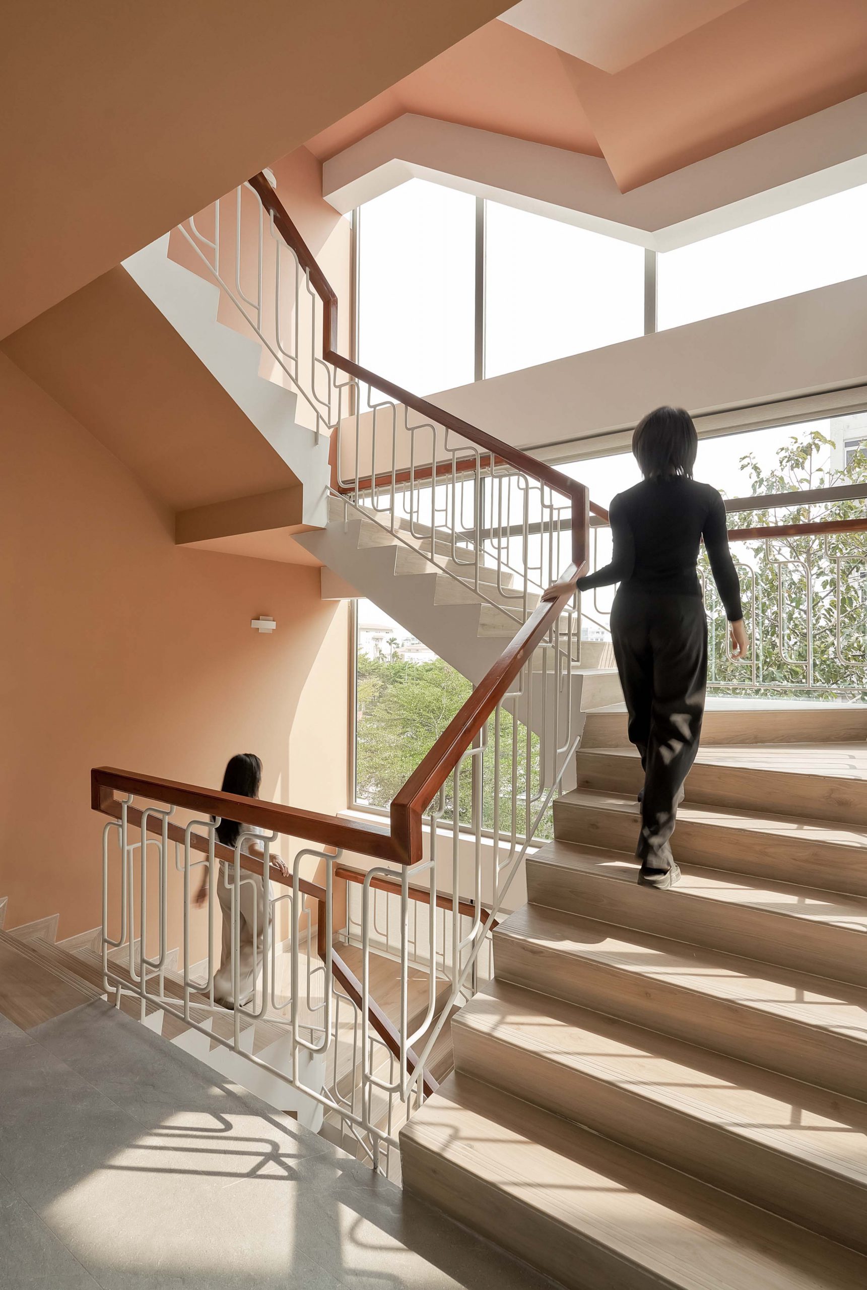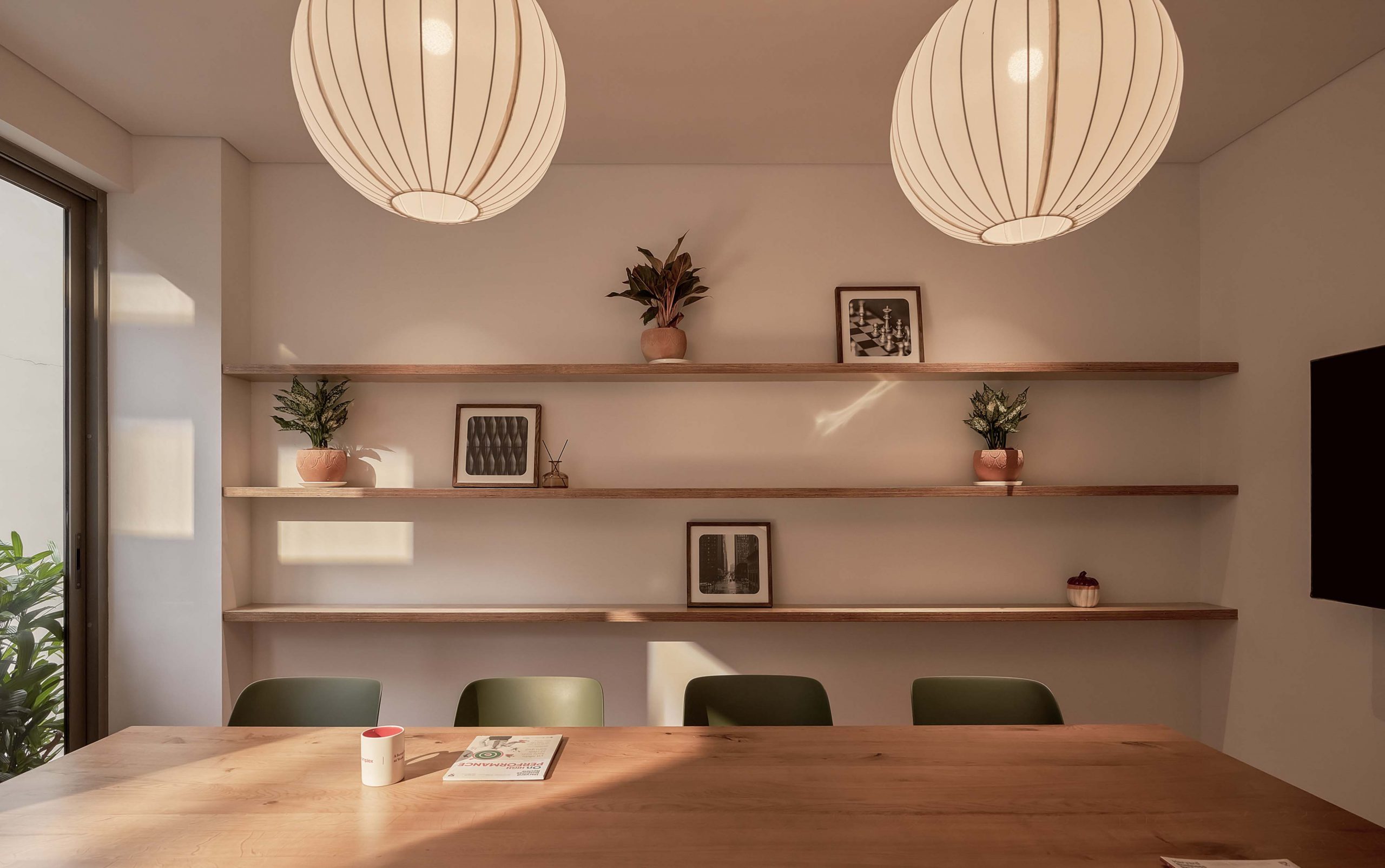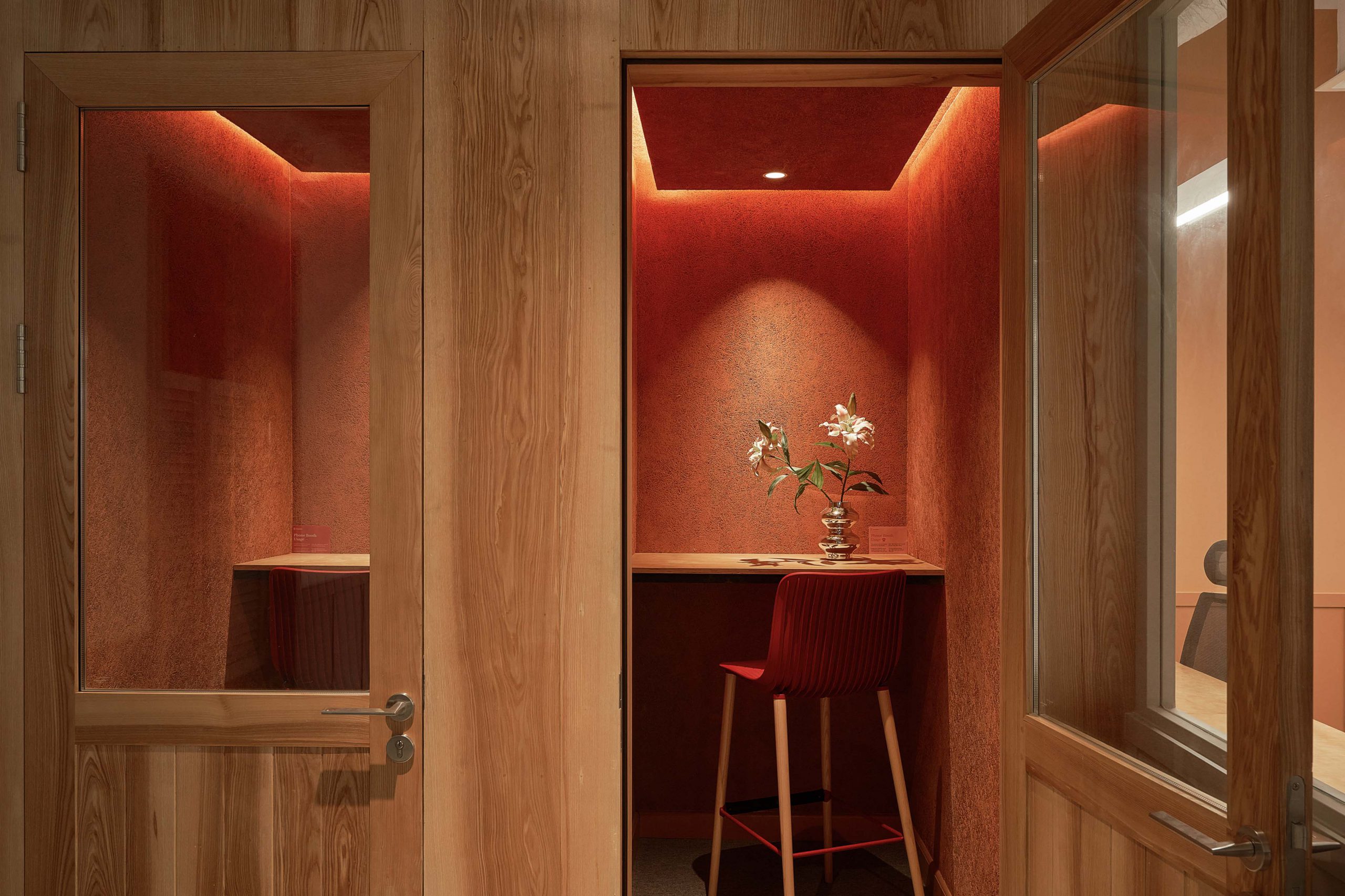 Bringing inspiration from natural and less chemical materials, the wavy ceiling using Vietnamese Melaleuca timber, and the clay color palette create a sense of intimacy and maturity while maintaining a relaxed and informal ambiance.