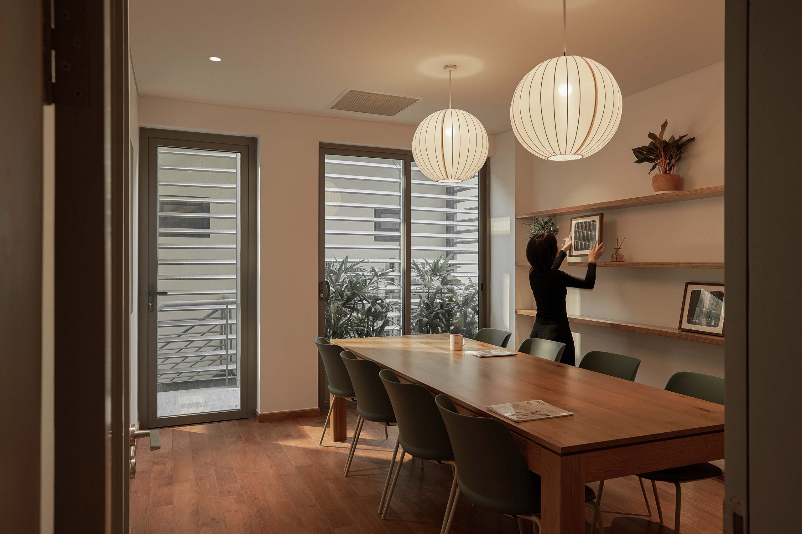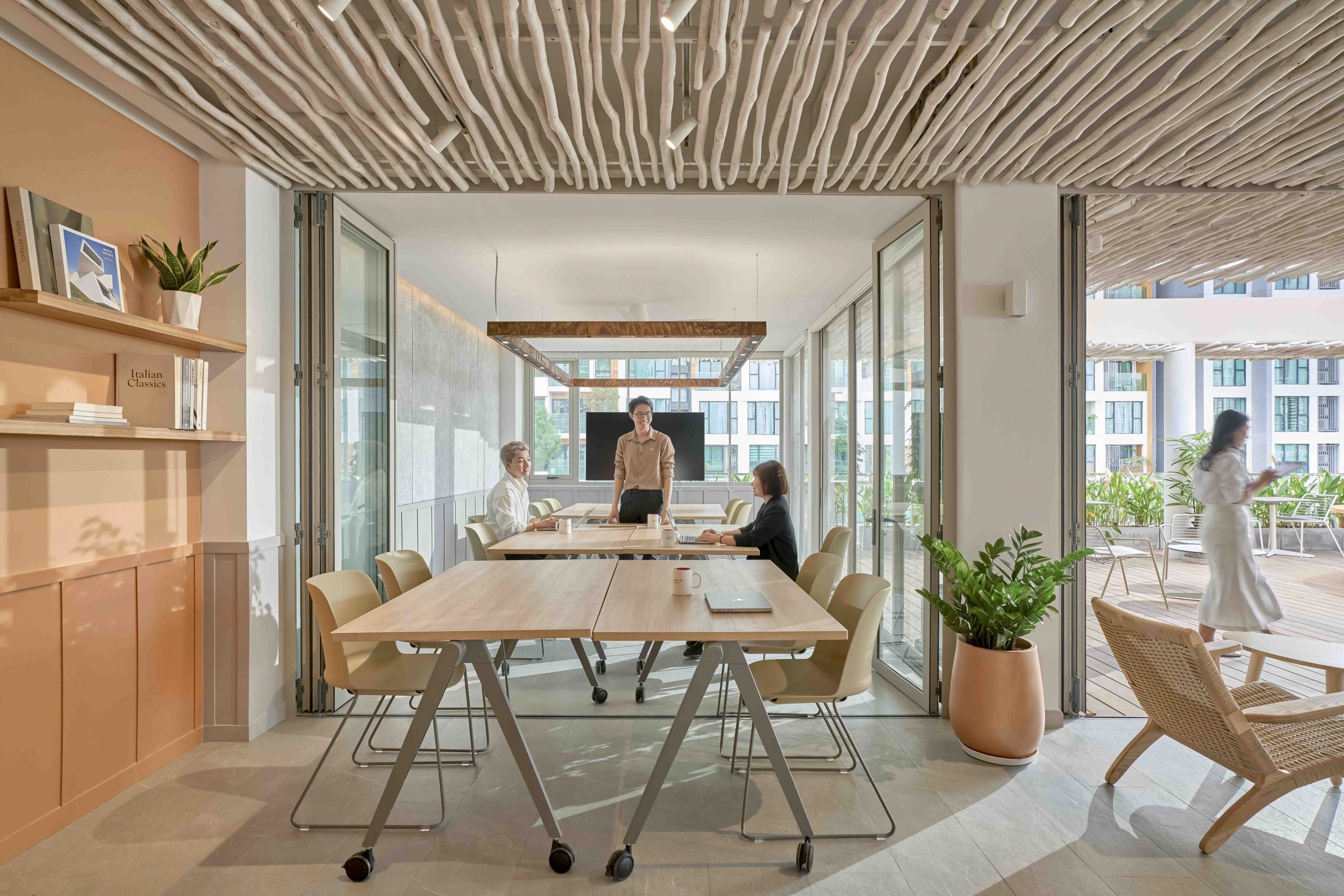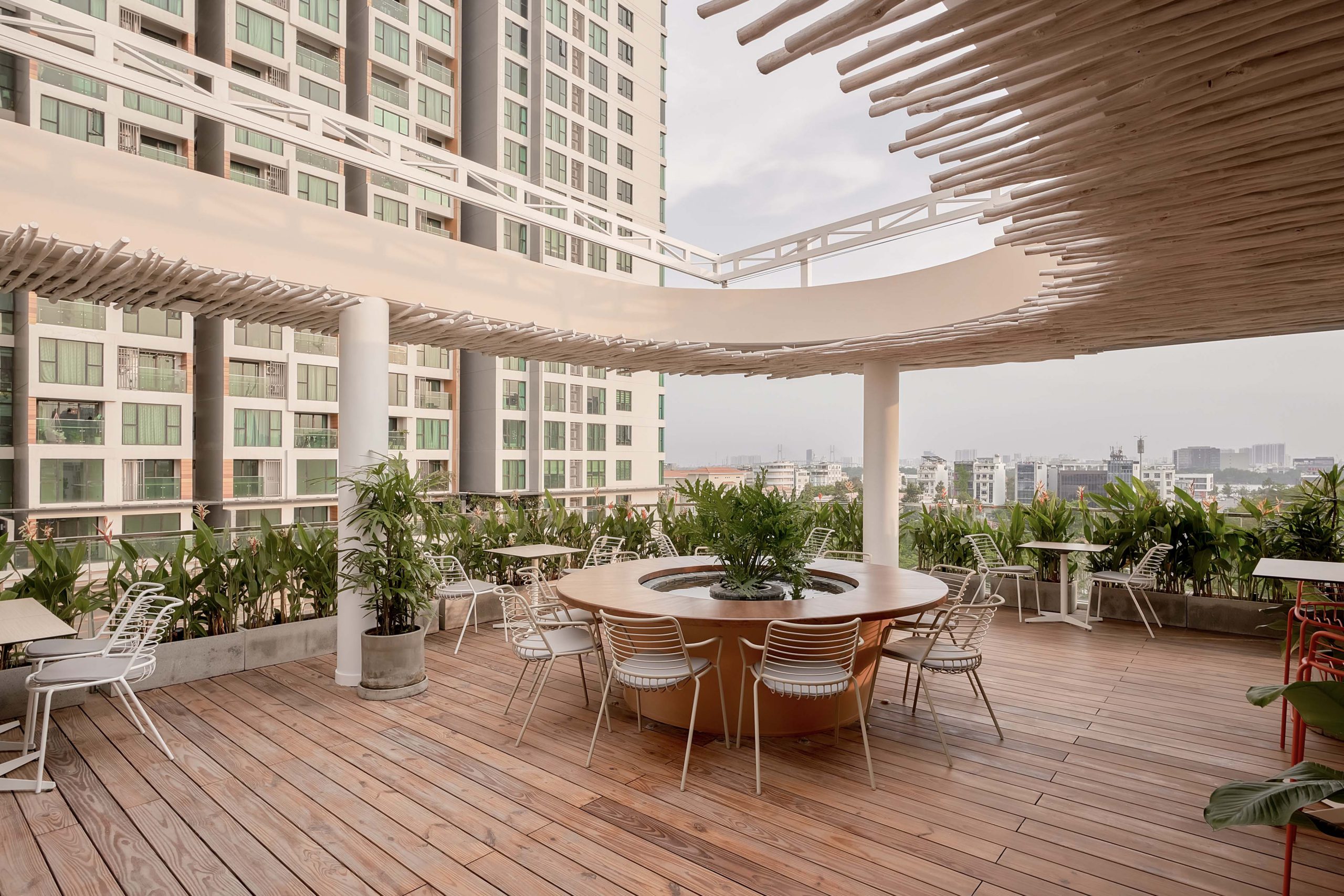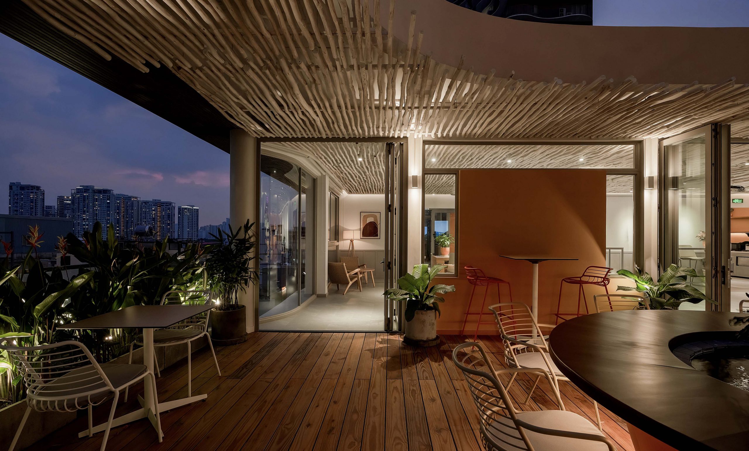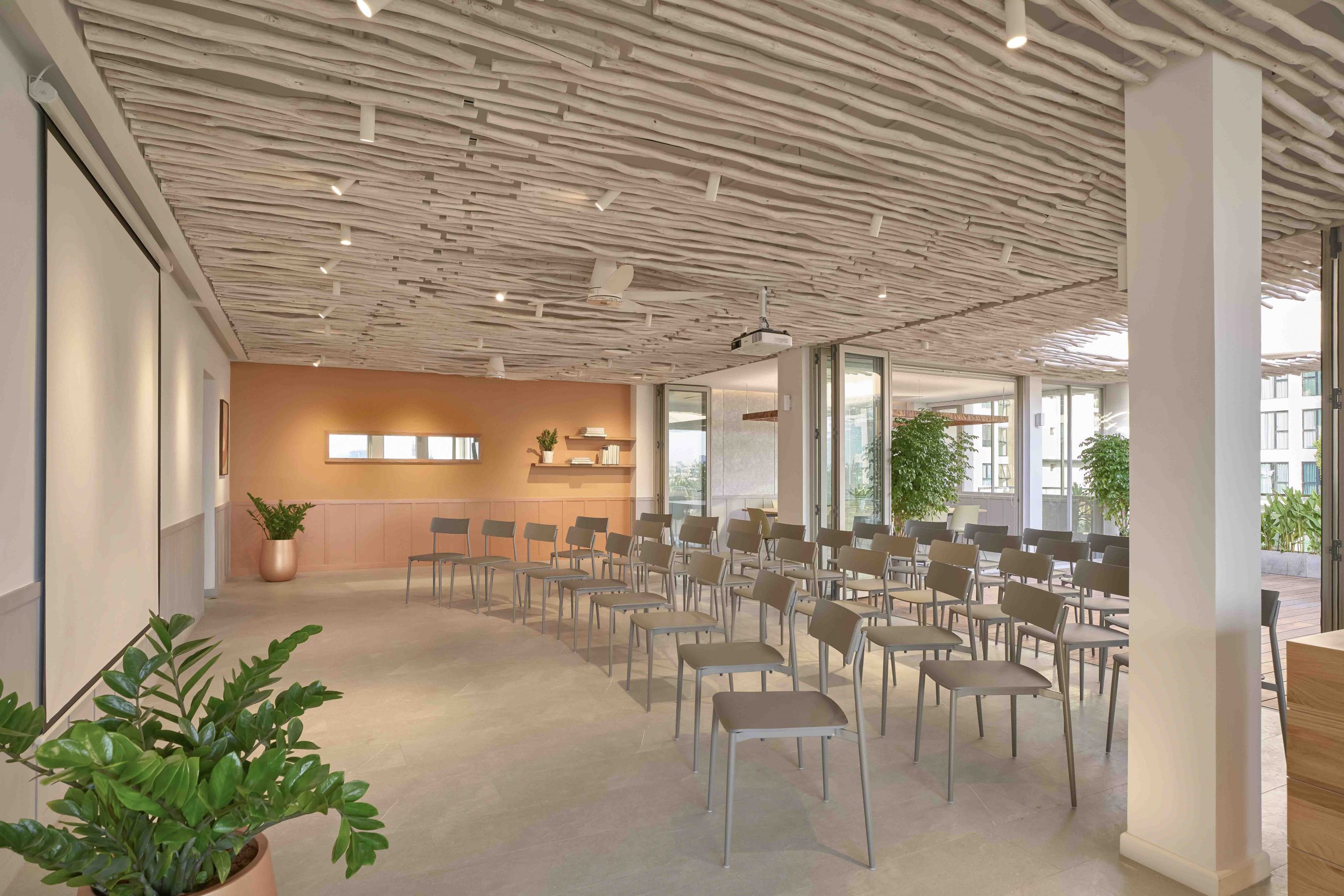 The rooftop area features flexible spaces and a multi-purpose room that can be fully open to the surrounding tropical garden, offering a sense of privacy and tranquility, perfect for informal meetings or moments of restoration.
