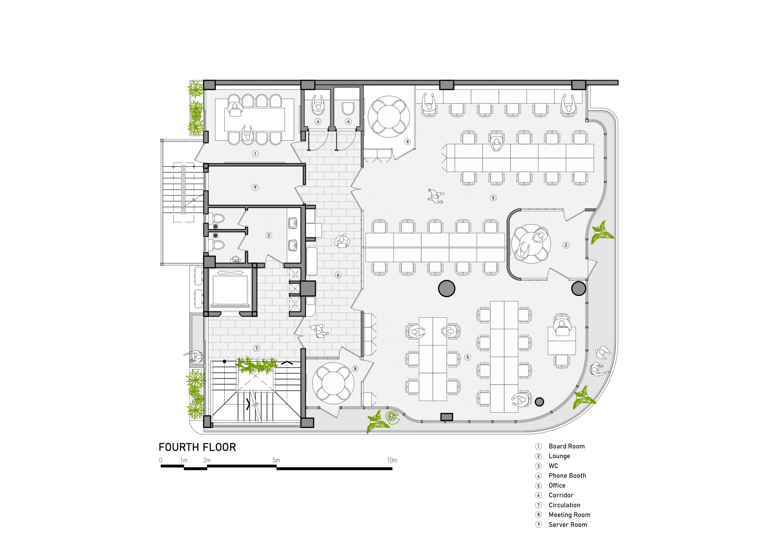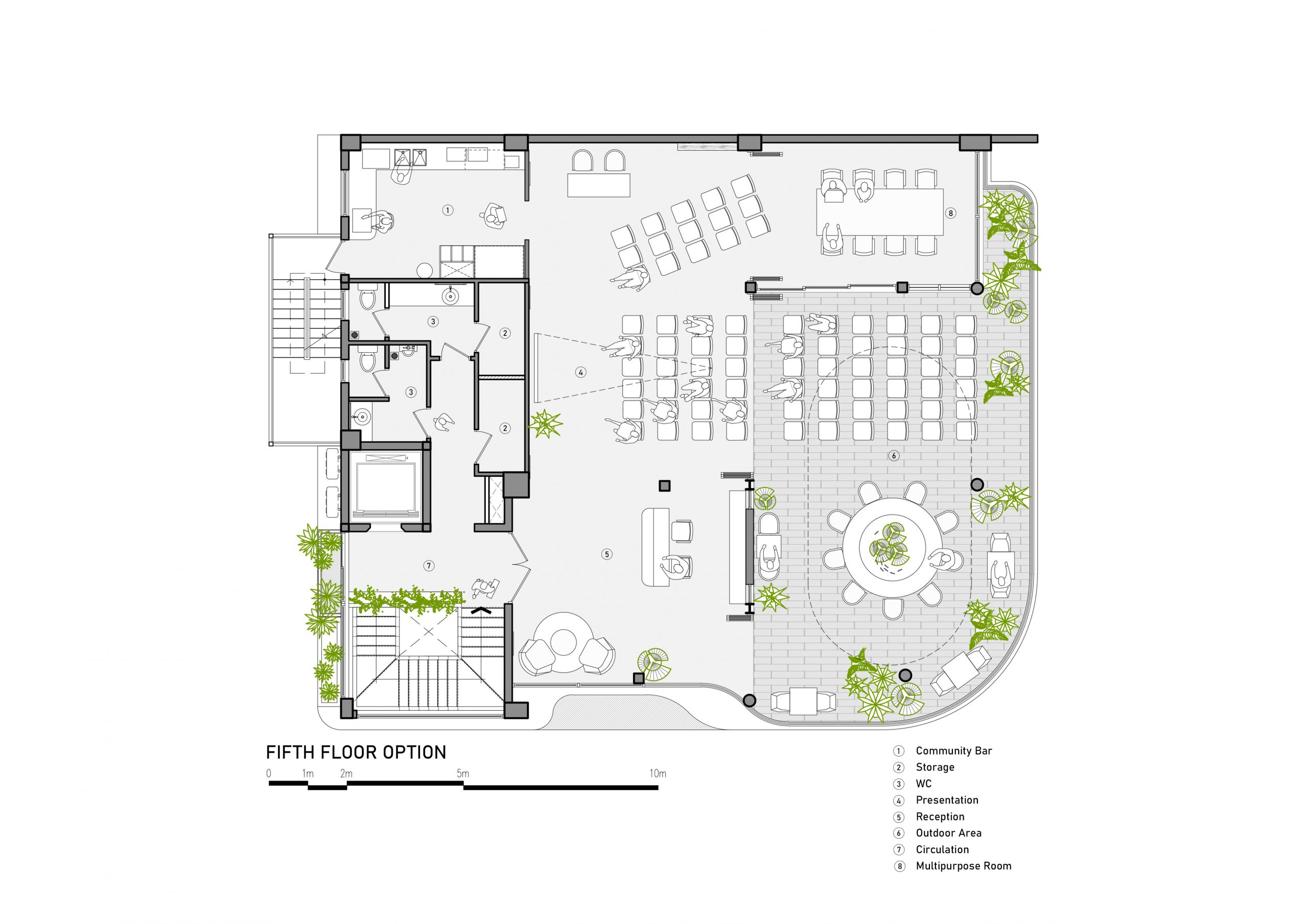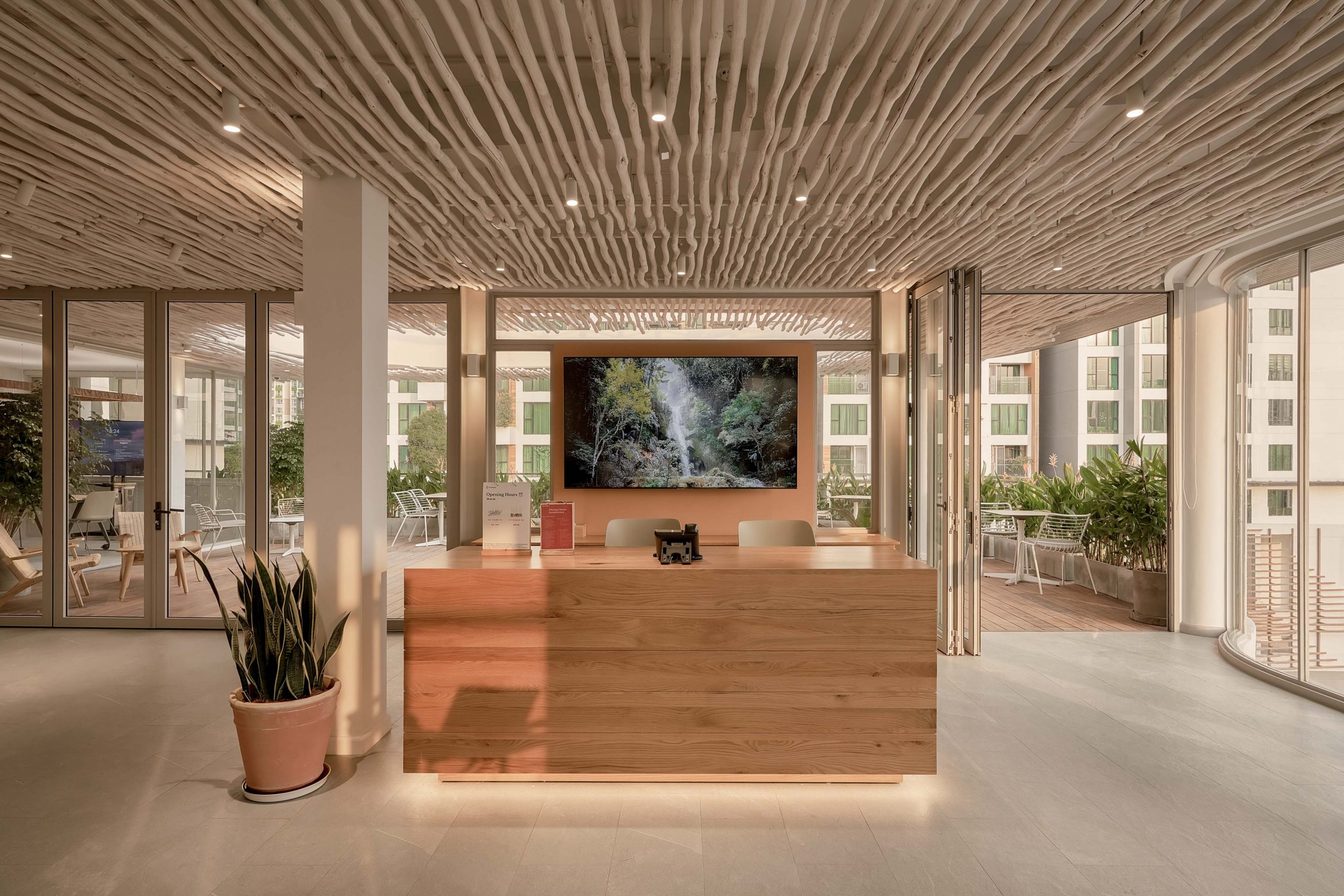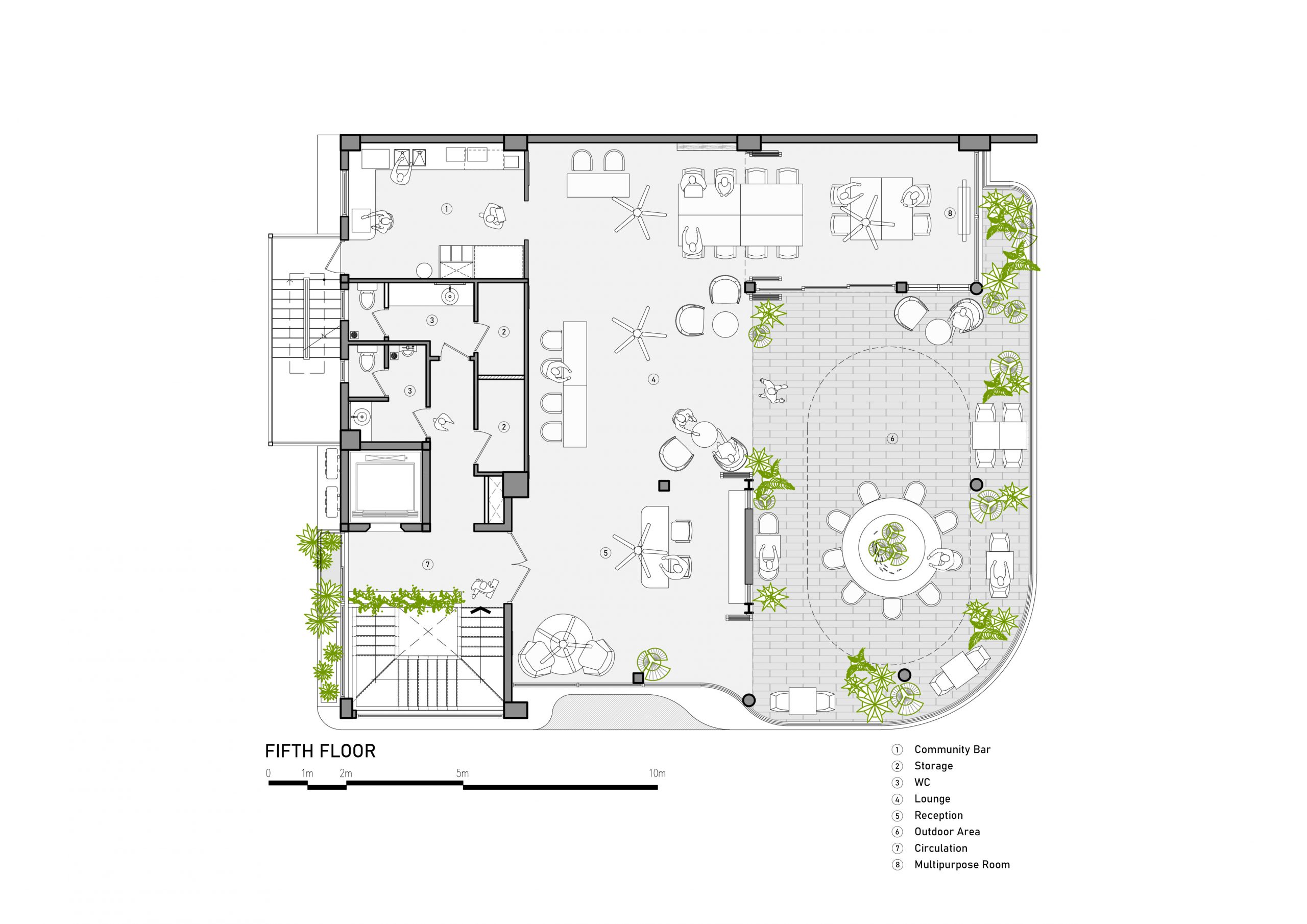 The rooftop area features flexible spaces and a multi-purpose room that can be fully open to the surrounding tropical garden, offering a sense of privacy and tranquility, perfect for informal meetings or moments of restoration.