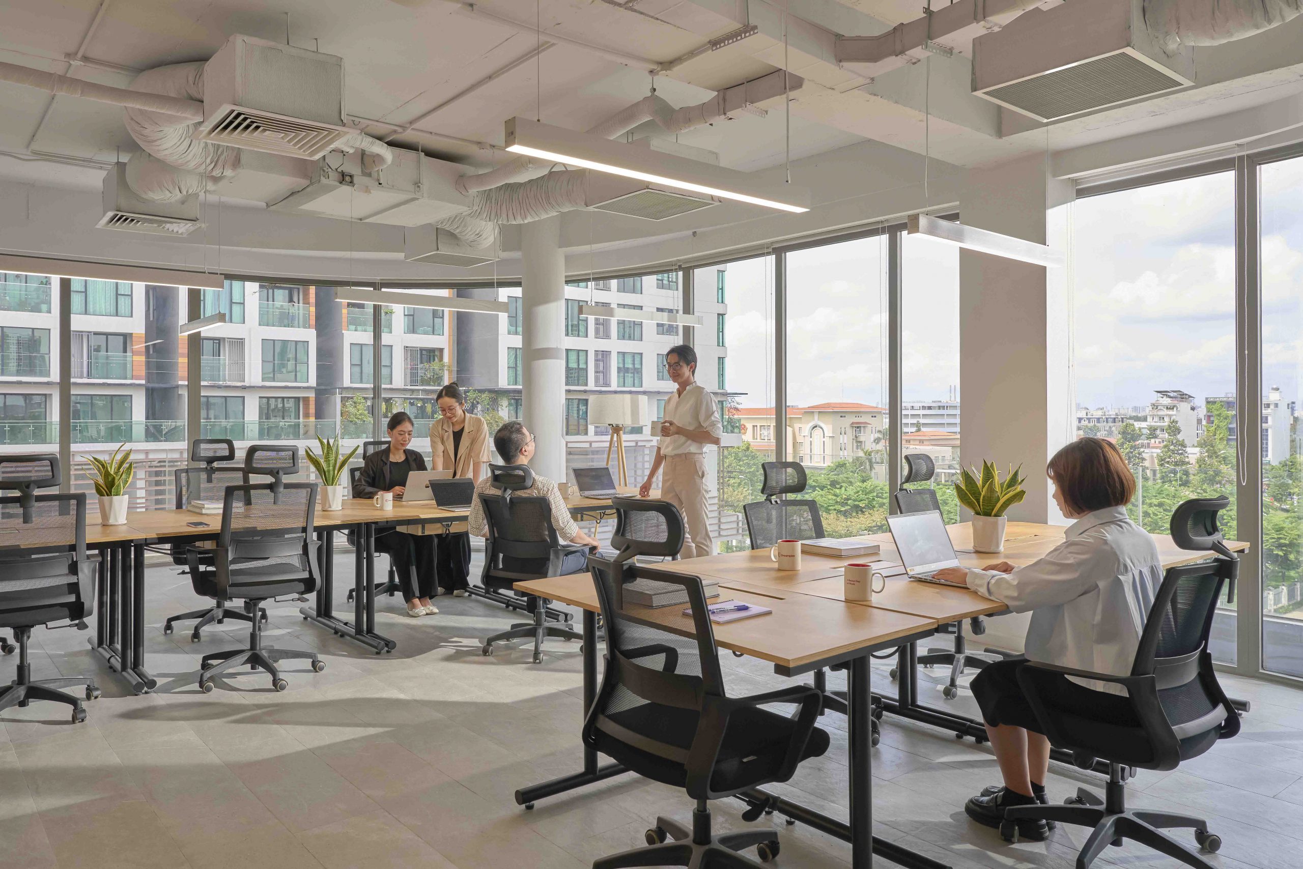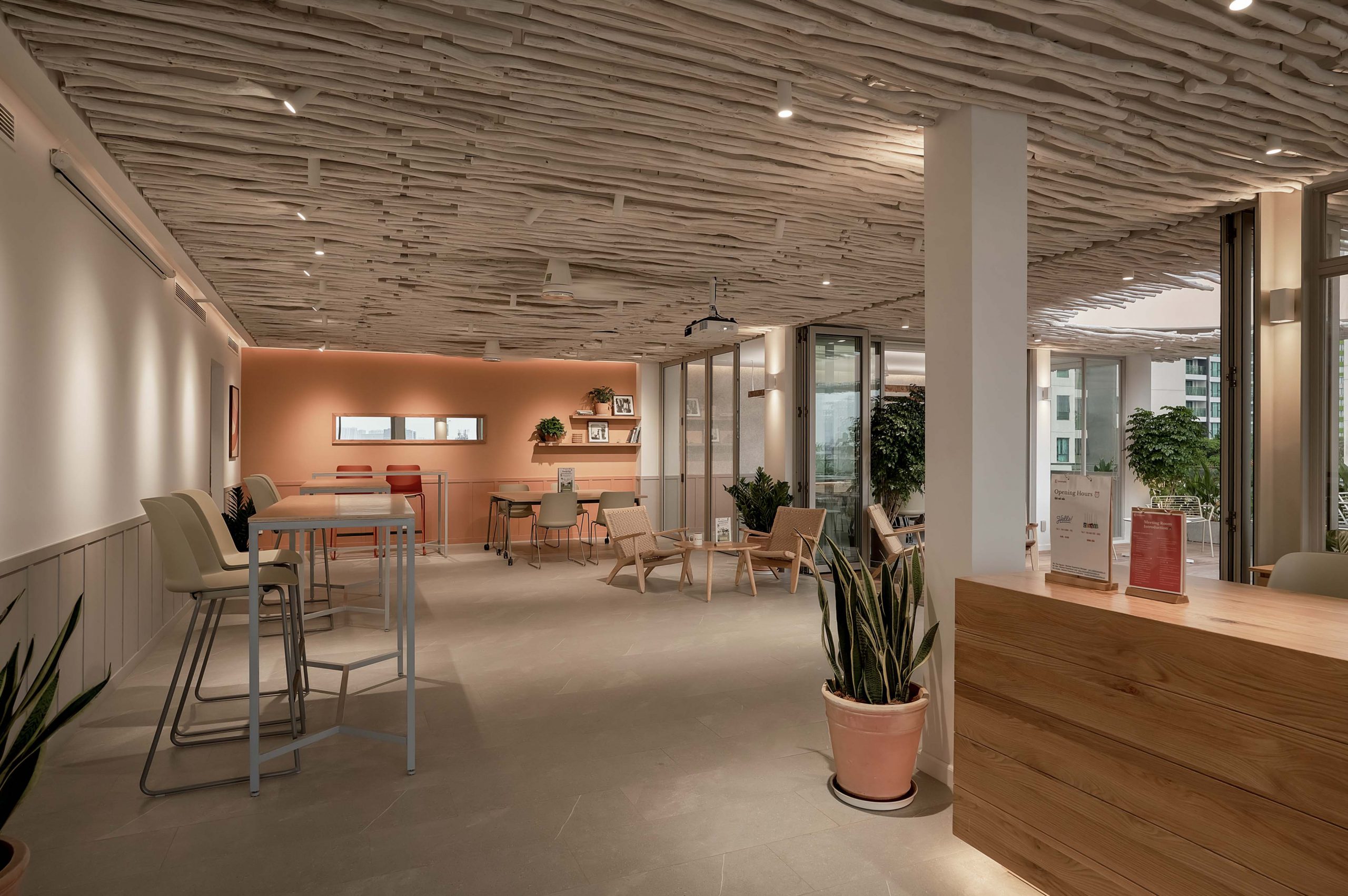 A harmonious fusion of classic Parisian workshop and vibrant tropical elements. This innovative space was designed to suit a multigenerational workforce, promoting both traditional work environments and flexible coworking areas.