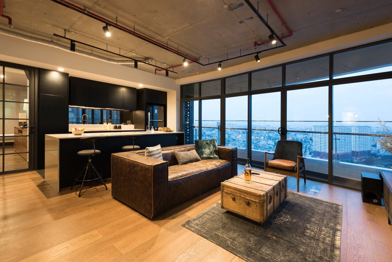 T3 ARCHITECTS just designed this Industrial LOFT located in City Garden Towers in Saigon (Vietnam) developed by Refico developer. The existing 3 bedrooms apartments was very conservative and poor in terms of interior design: volumes, circulation, color palette… The Client wanted to get a tailor-made Loft, industrial but cozy, with a design mixing European and Asian culture. T3 revised first the layout to create a large Living room connected with a room which can be used as a home office as well as to welcome guests. T3 also decided to demolish some partitions to create a real Master Bedroom with a proper walking closet. False ceiling has been removed to make the concrete appears and reinforce the “loft” aspect but also to get a more generous volume. All the furniture have been tailor-made or sourced by T3 as well as rugs and Art pieces from Laurent WEYL (photographer).