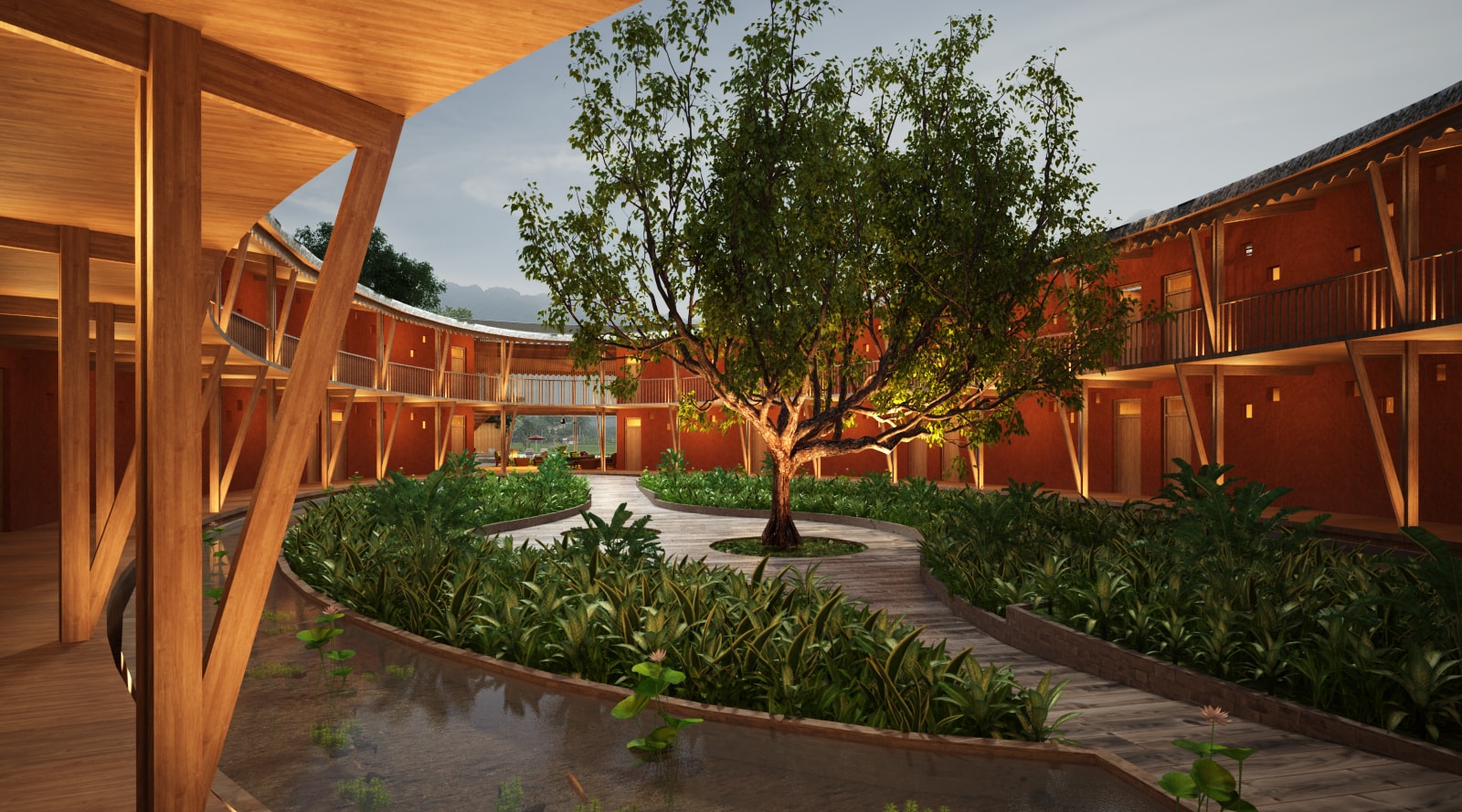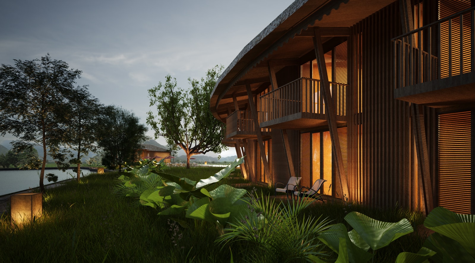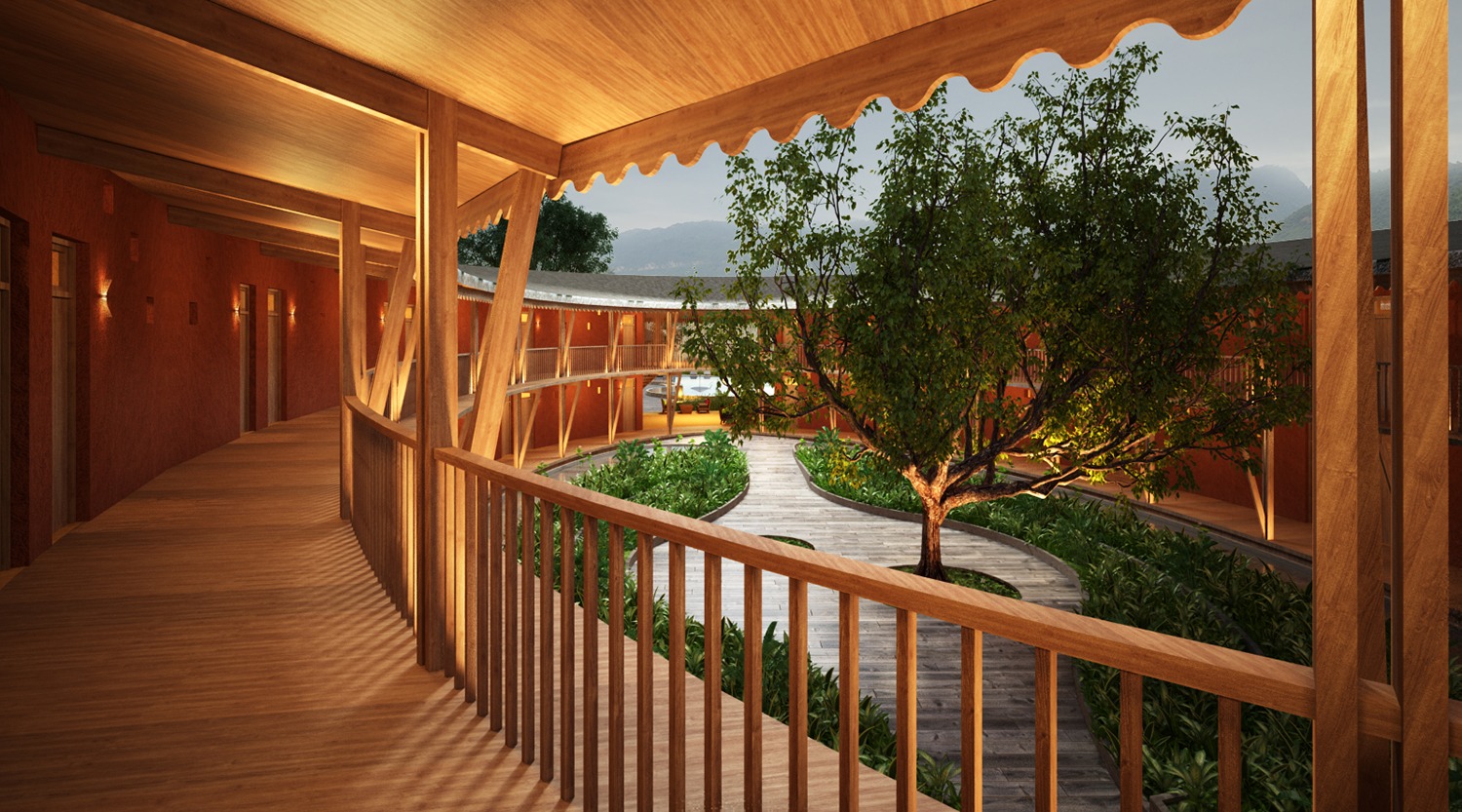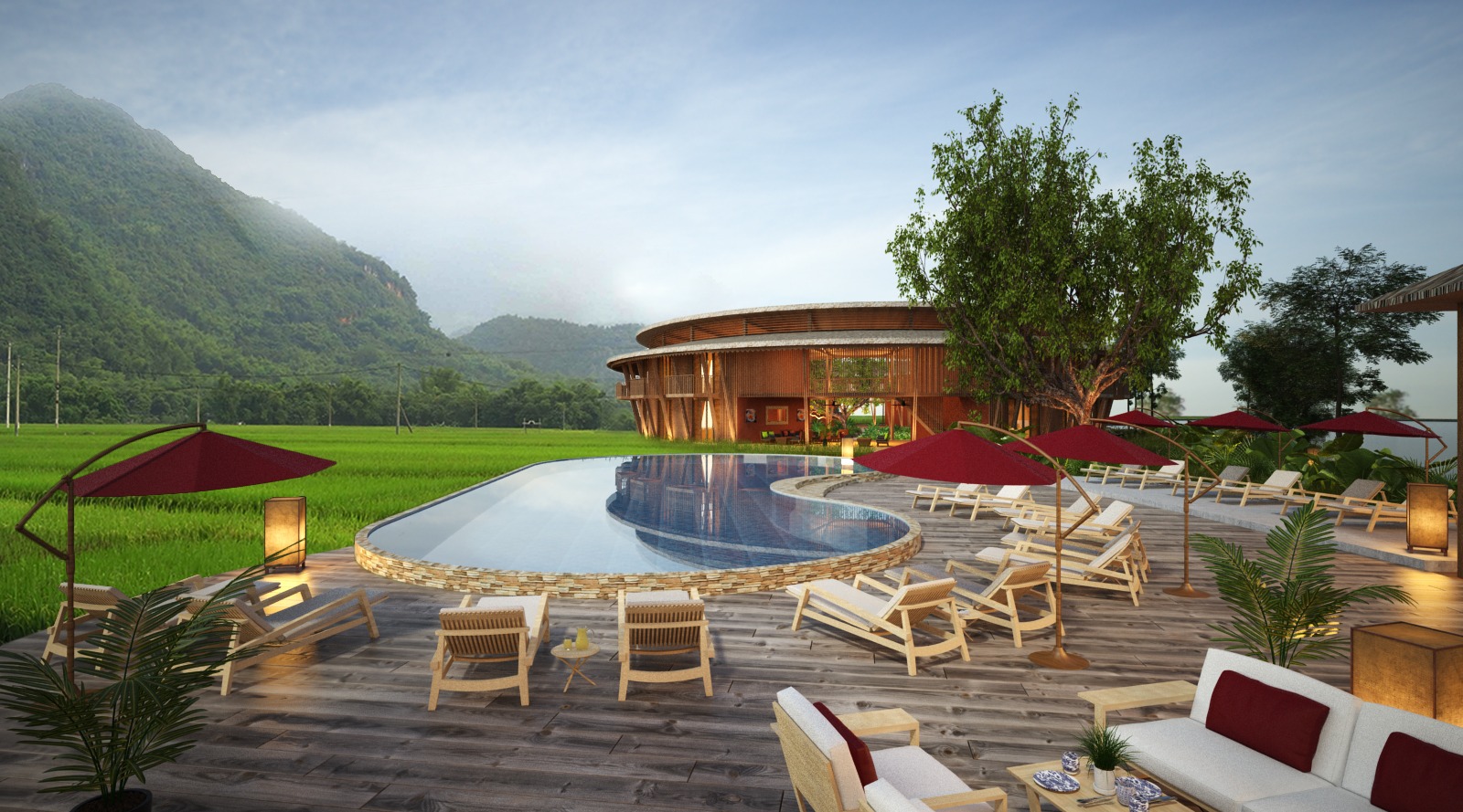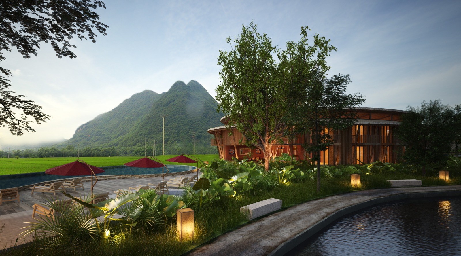 Guests should get the feeling of the Nature all around, between water element (lake) and vegetation (rice fields and trees). The buildings have been designed to be the most integrated to the landscape as possible, without disturbing the look on the landscape.