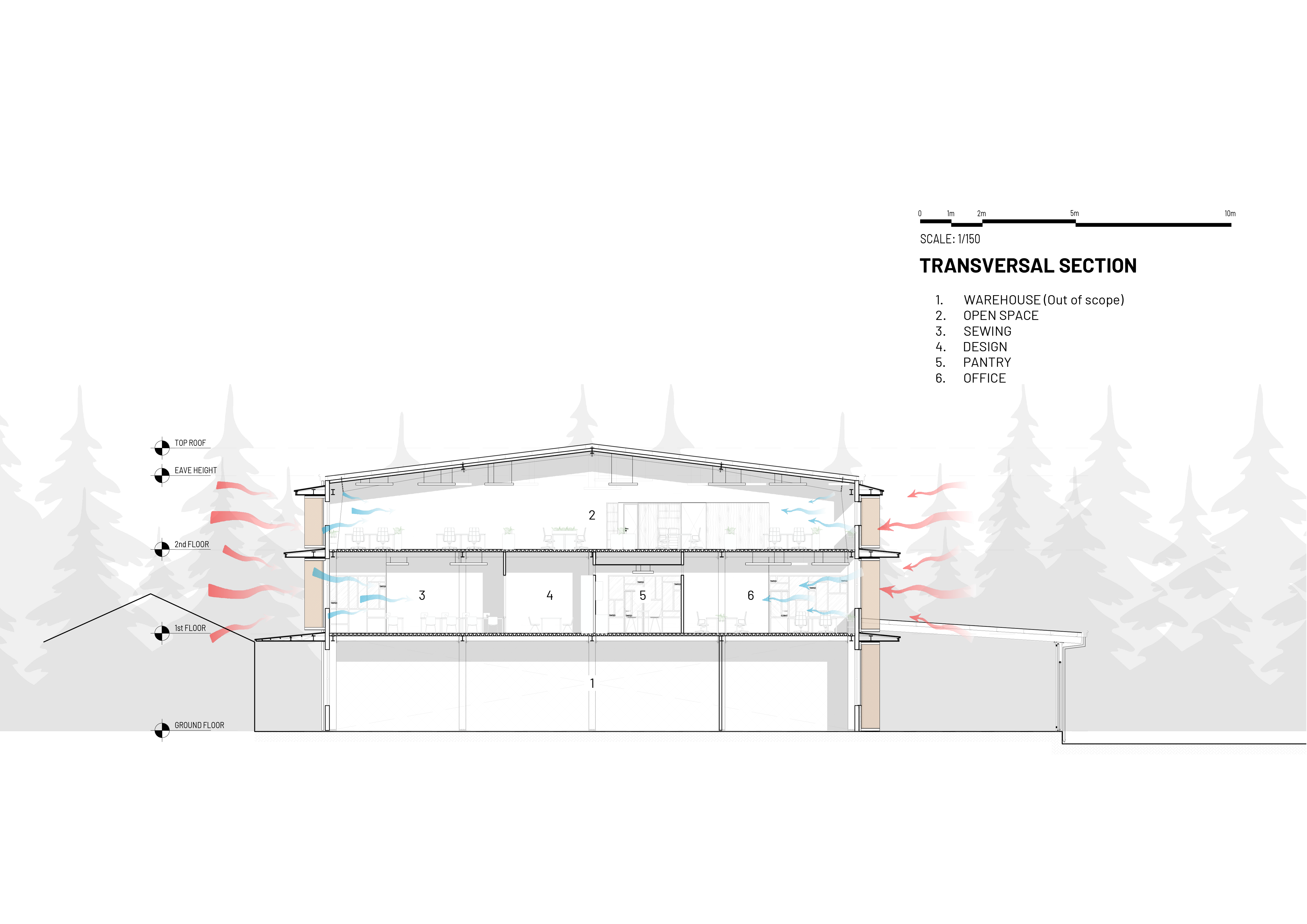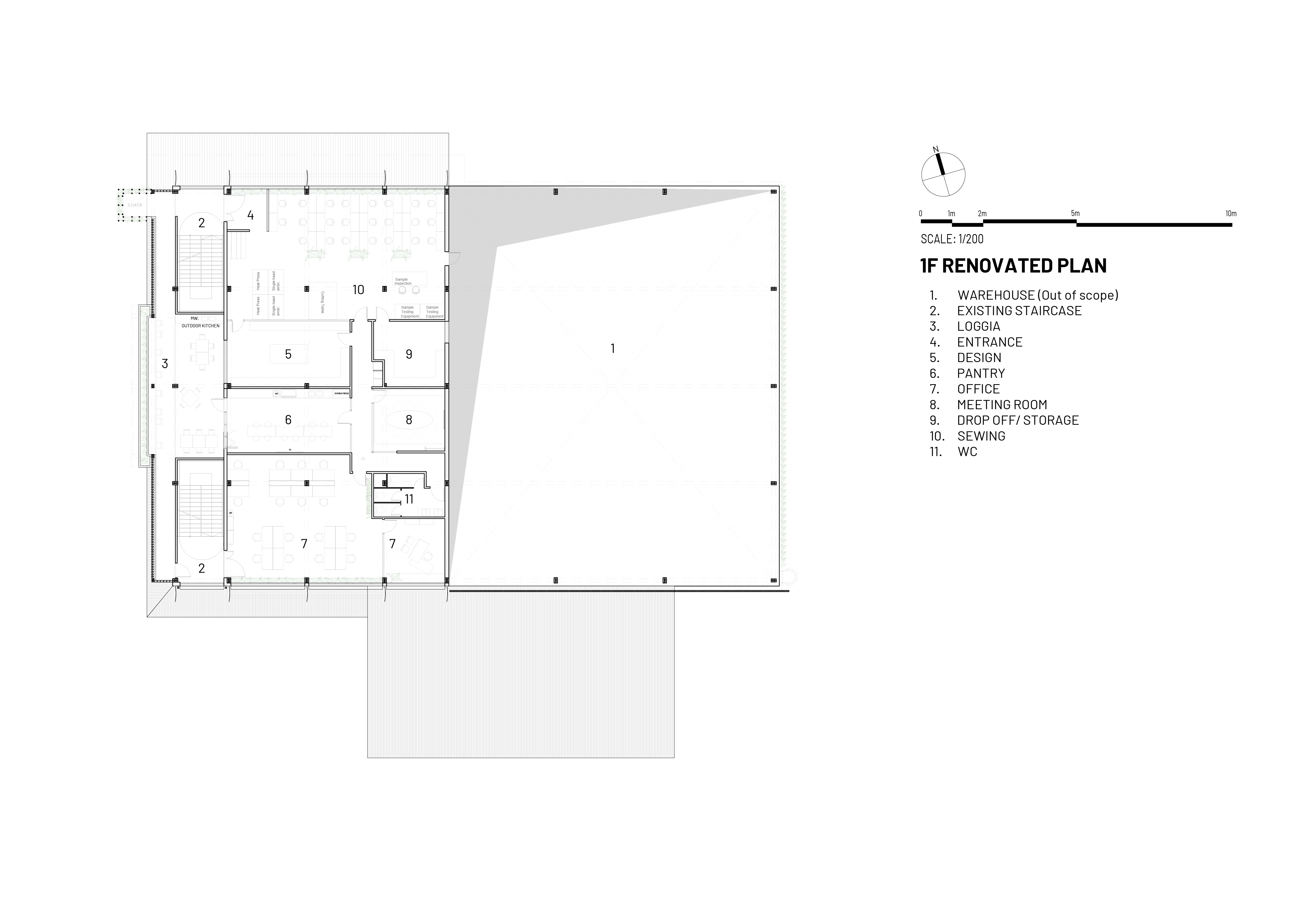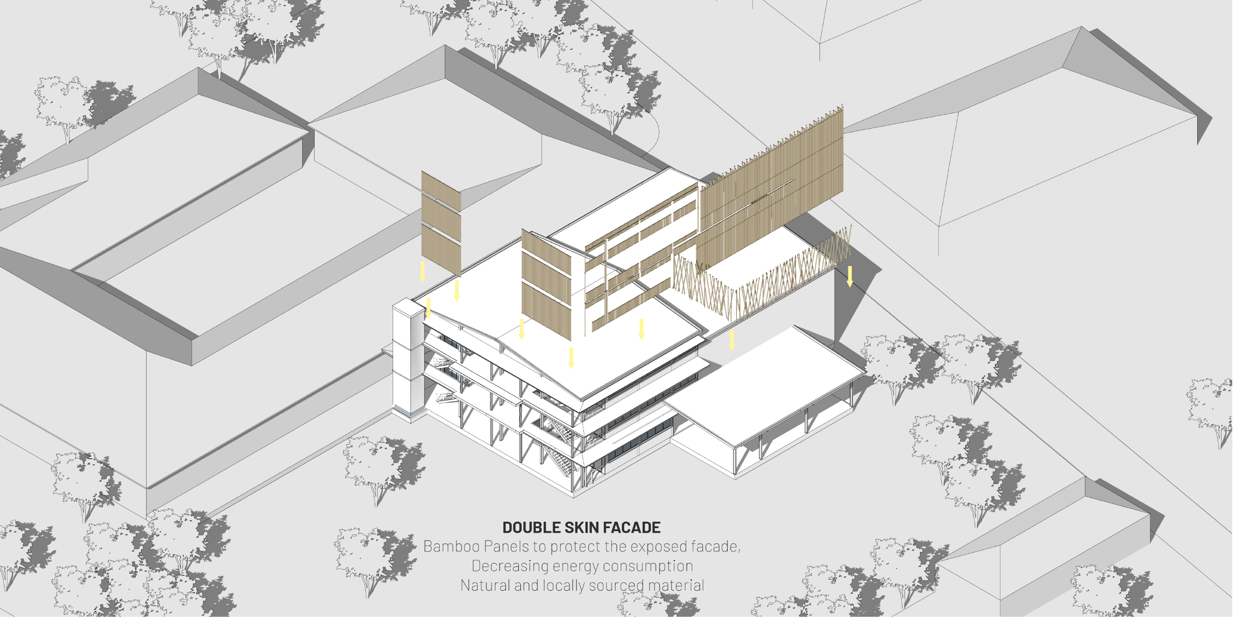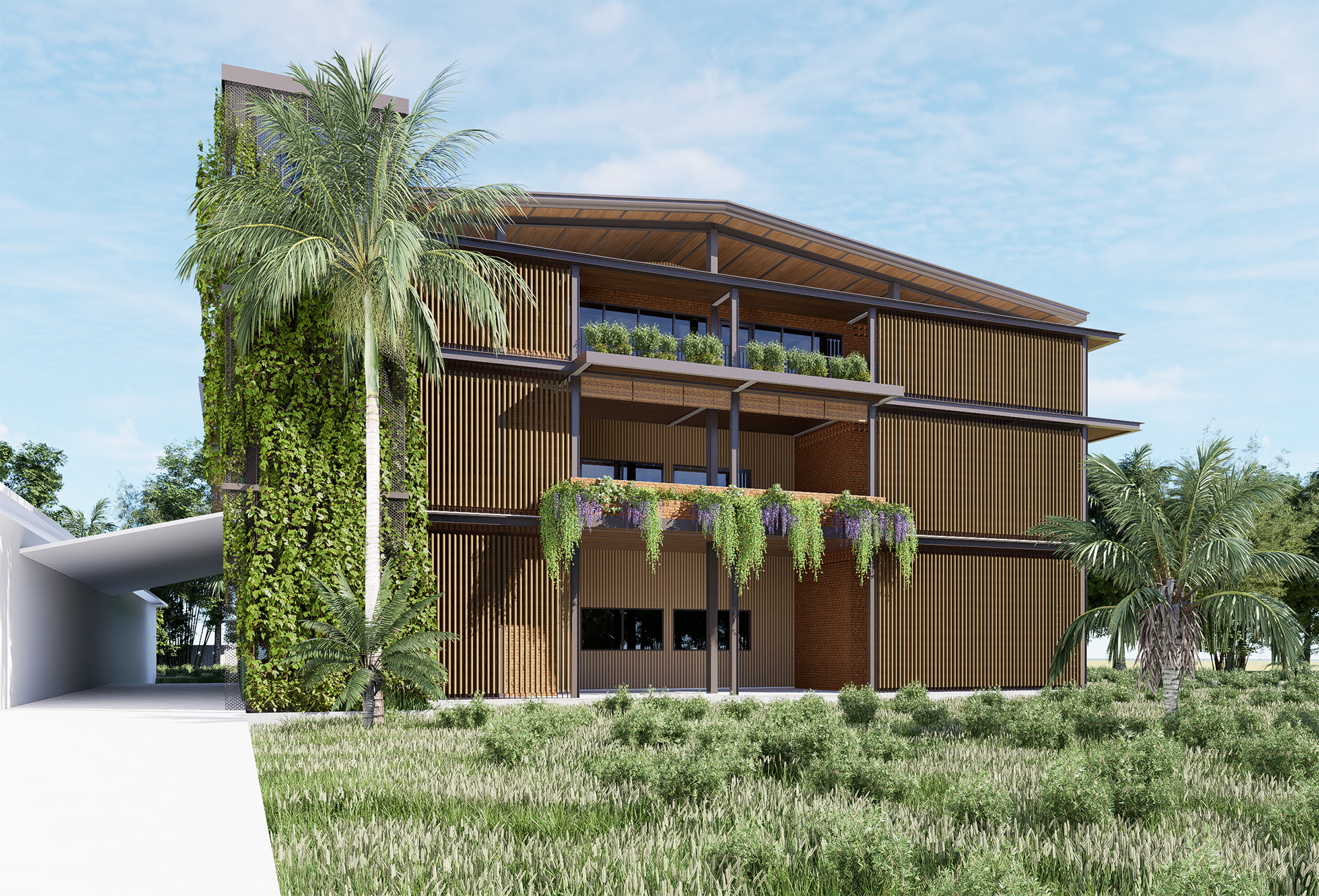 The PACTICS Factory in Siem Reap, Cambodia, has been producing high-quality garments like backpacks, face masks, and clothing for 20 years. To support its growth, a new warehouse was recently completed, and T3 Architects was tasked with improving the existing building by adding a double façade to reduce heat and designing two-level office spaces with an extension. The design prioritized natural, local, and sustainable materials—such as locally fired bricks, bamboo, rattan, and wood fiber—, with new roof overhangs and tensile sunshades for additional protection, aligned with PACTICS’ commitment to sustainability and a welcoming work environment.