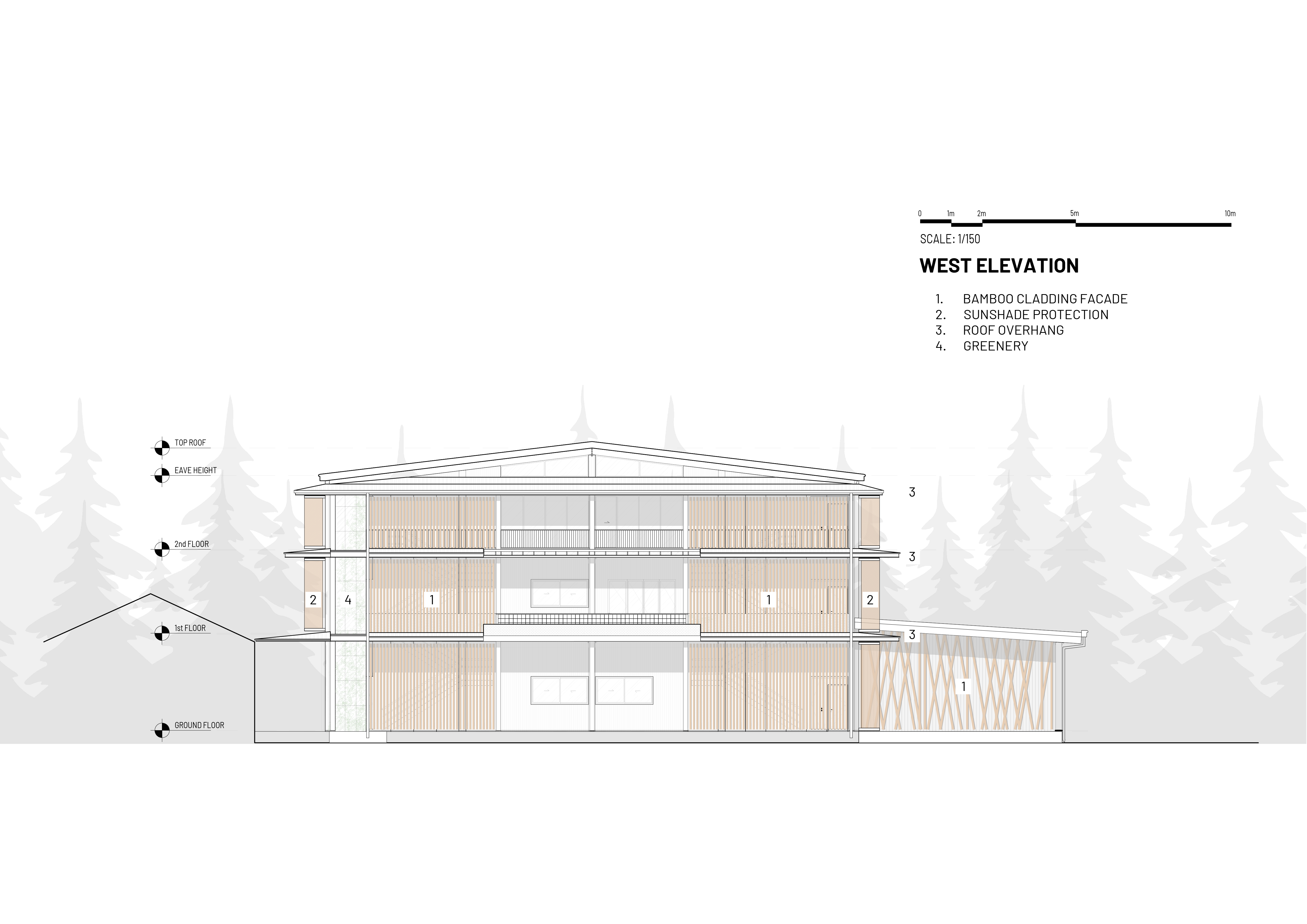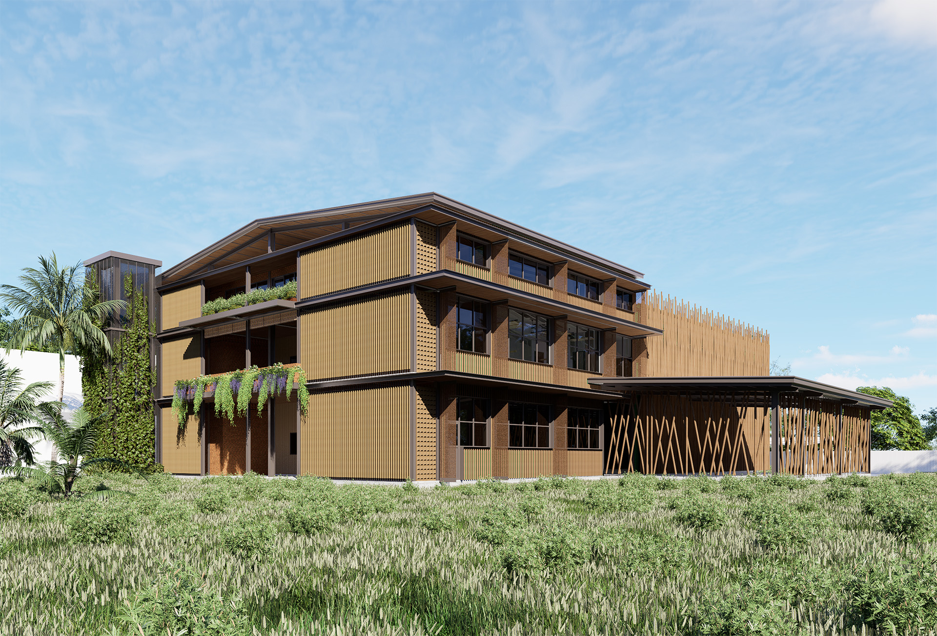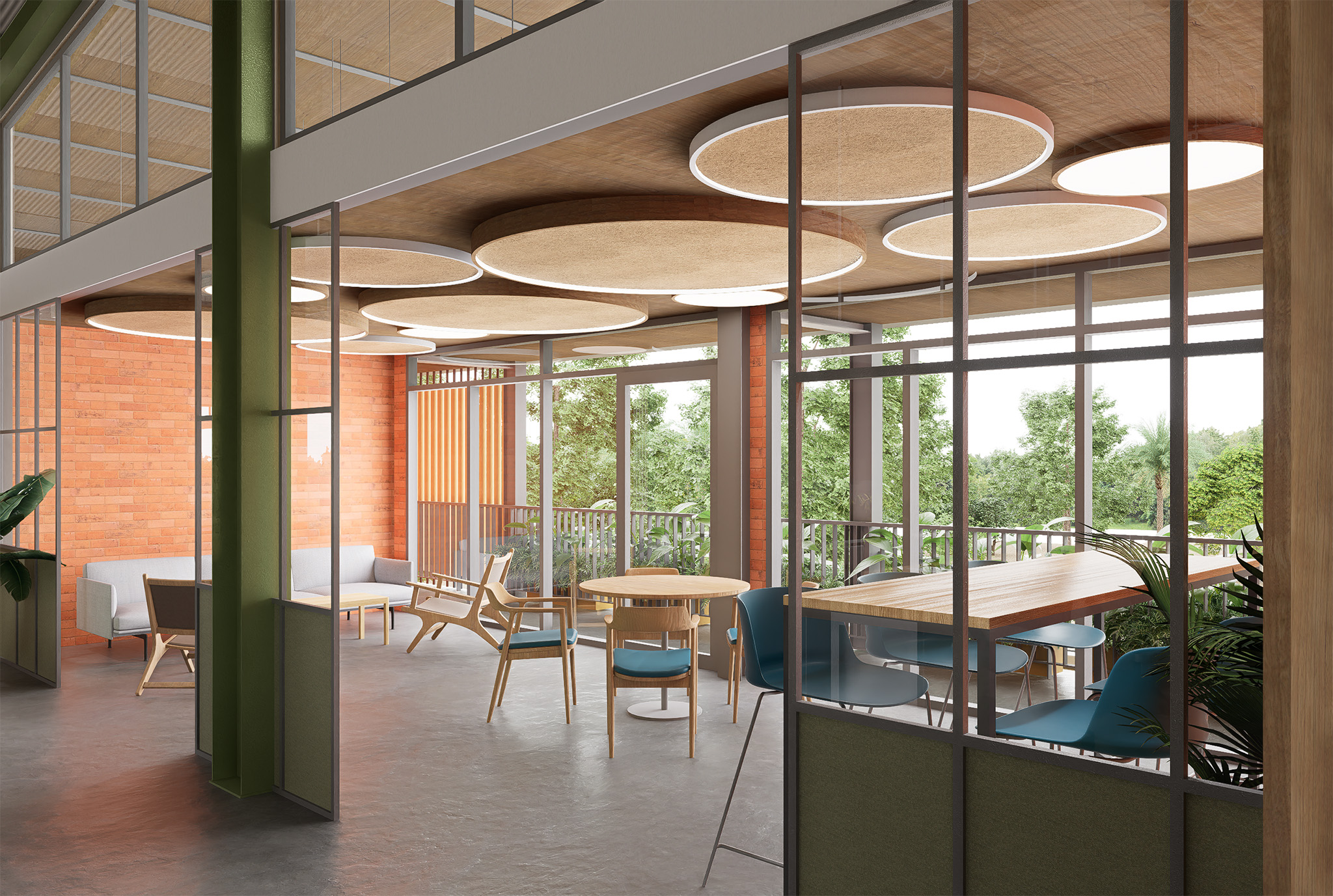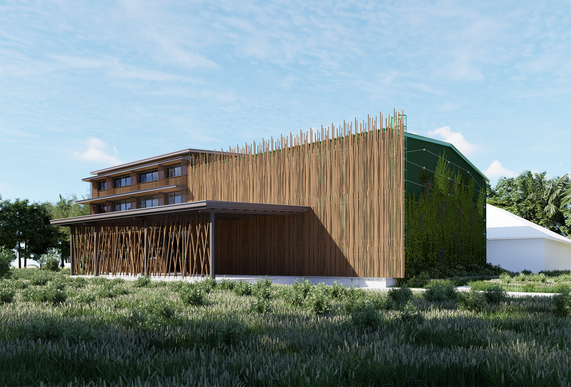 On the west façade, T3 introduced outdoor corridors, a loggia adjacent to the pantry, and an informal meeting area overlooking the landscape. Bamboo louvers clad the whole façade, and extended roof overhangs provide shade and protection from monsoon rains. The south façade was clad entirely in bamboo poles to improve thermal comfort and enhance the building’s appearance. Interior spaces were designed for comfort and individuality, using warm tones and natural materials like plywood, wood, and bamboo. The result blends professionalism with a cozy, inviting atmosphere, leaving the client highly satisfied.