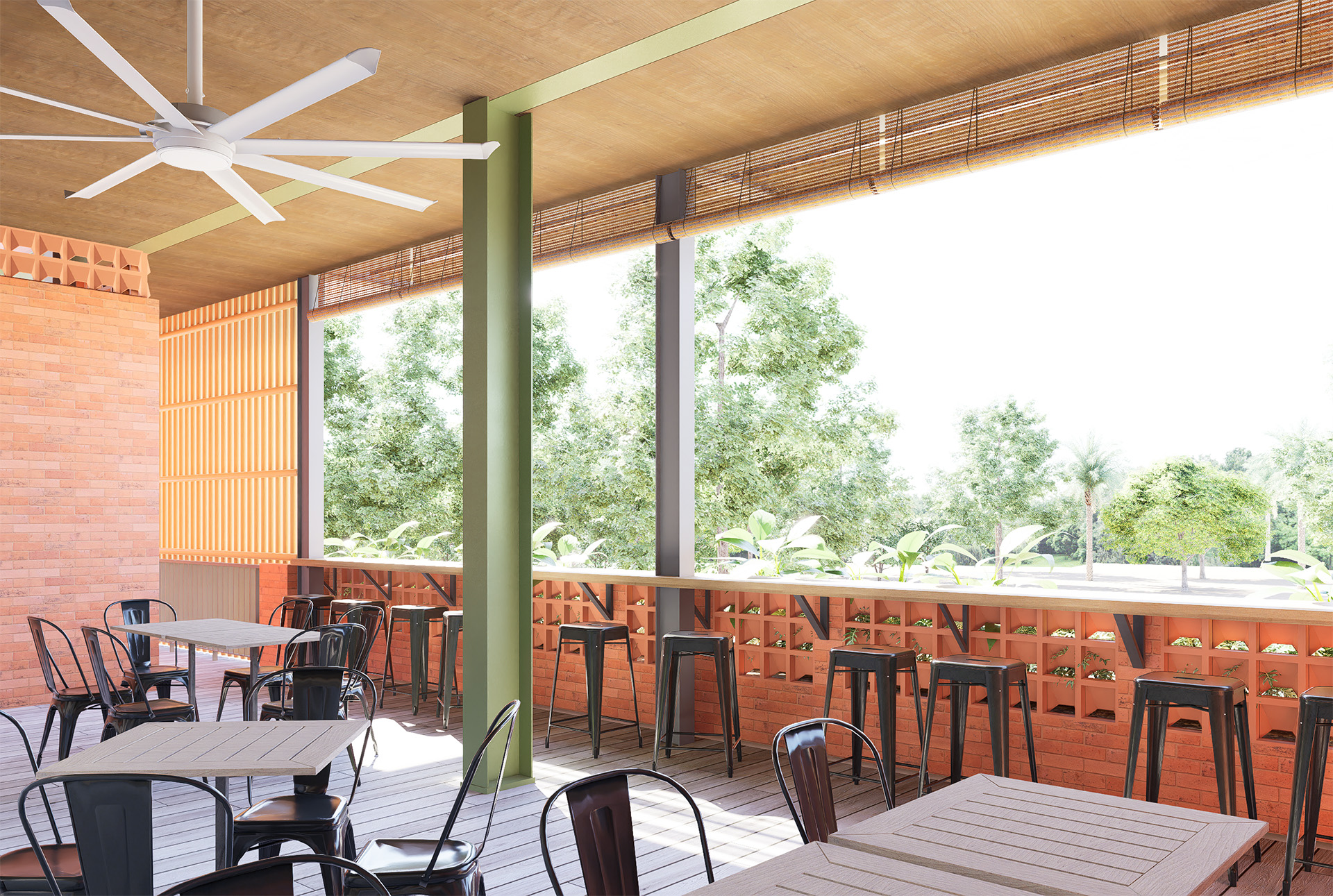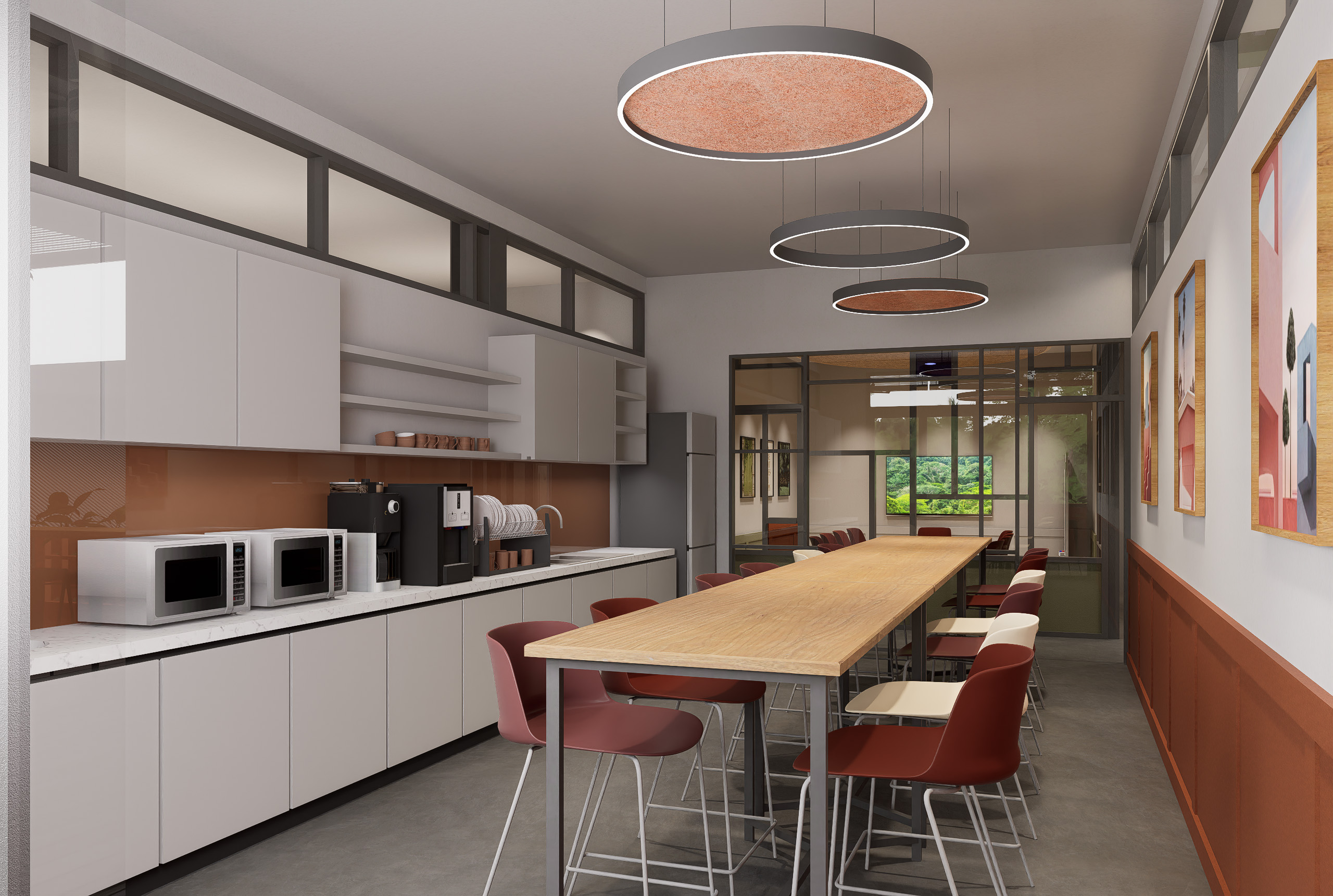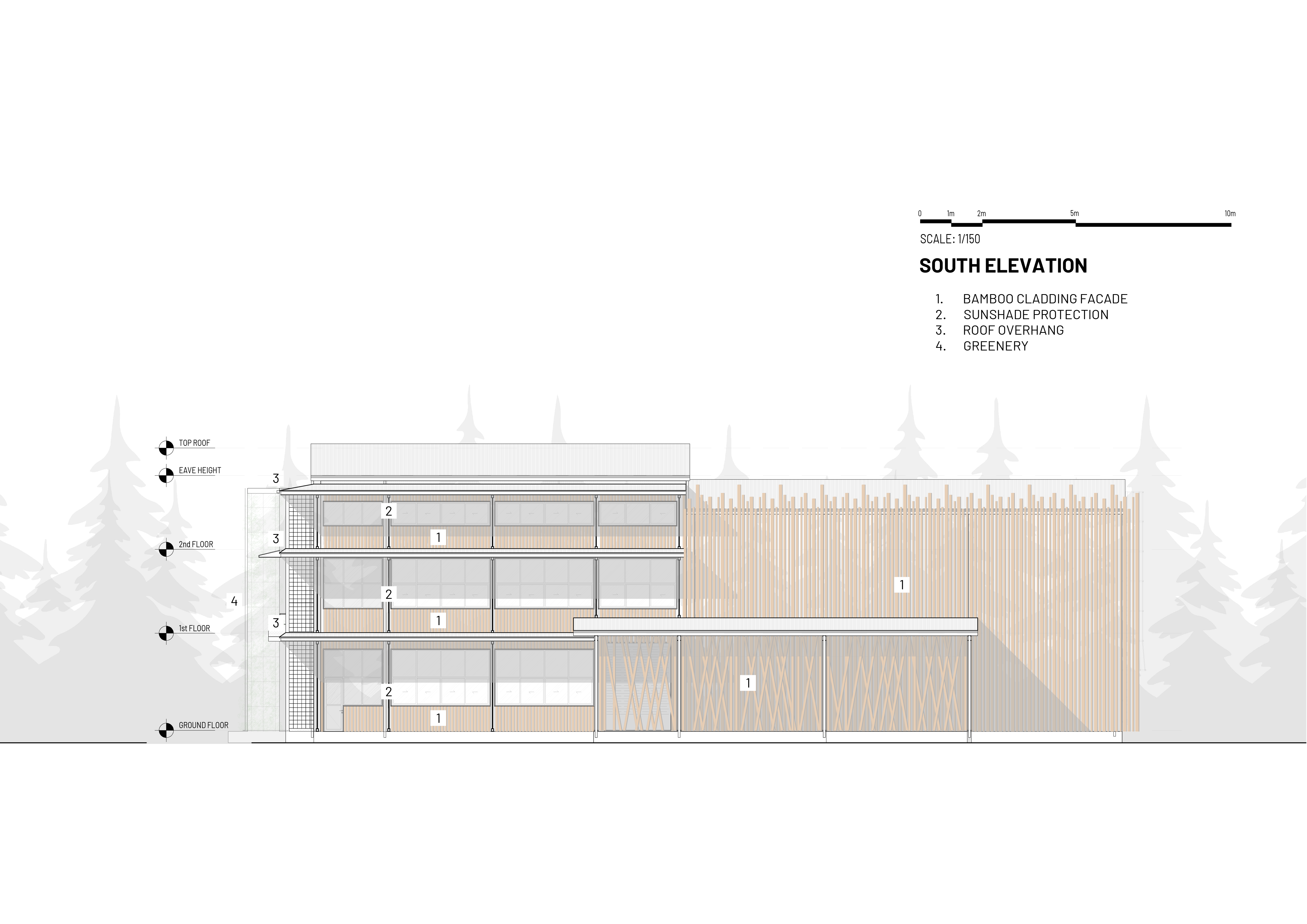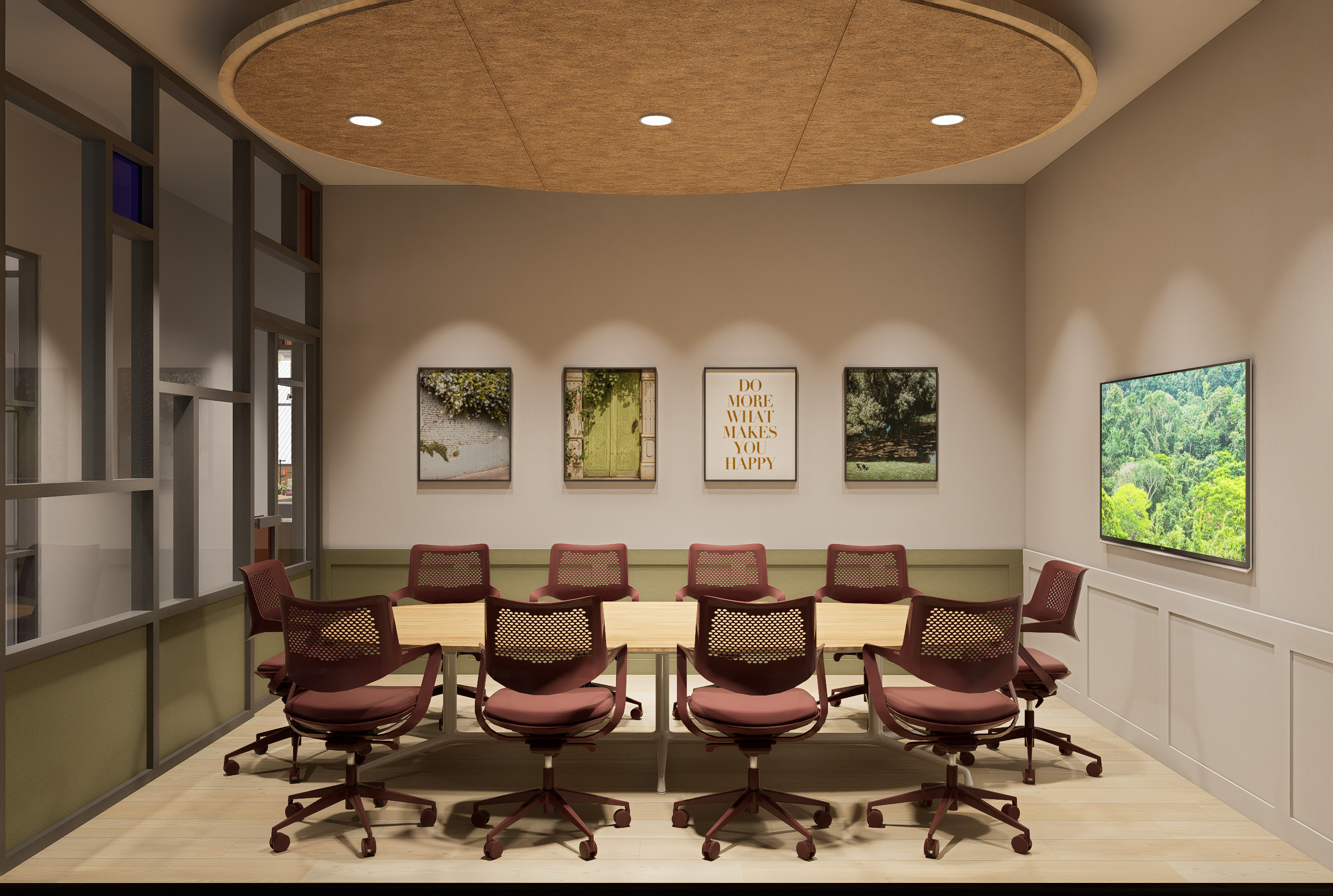 On the west façade, T3 introduced outdoor corridors, a loggia adjacent to the pantry, and an informal meeting area overlooking the landscape. Bamboo louvers clad the whole façade, and extended roof overhangs provide shade and protection from monsoon rains. The south façade was clad entirely in bamboo poles to improve thermal comfort and enhance the building’s appearance. Interior spaces were designed for comfort and individuality, using warm tones and natural materials like plywood, wood, and bamboo. The result blends professionalism with a cozy, inviting atmosphere, leaving the client highly satisfied.