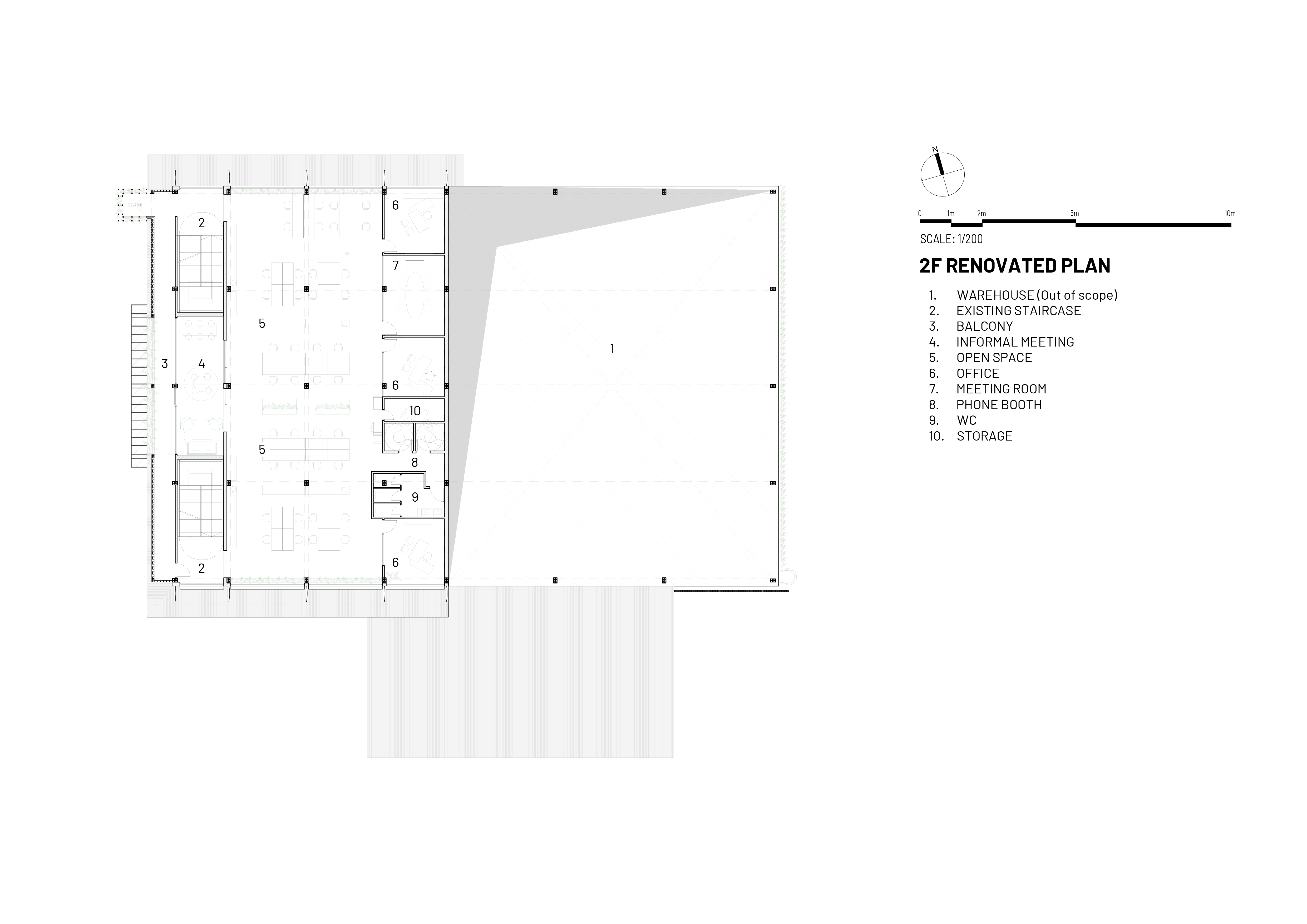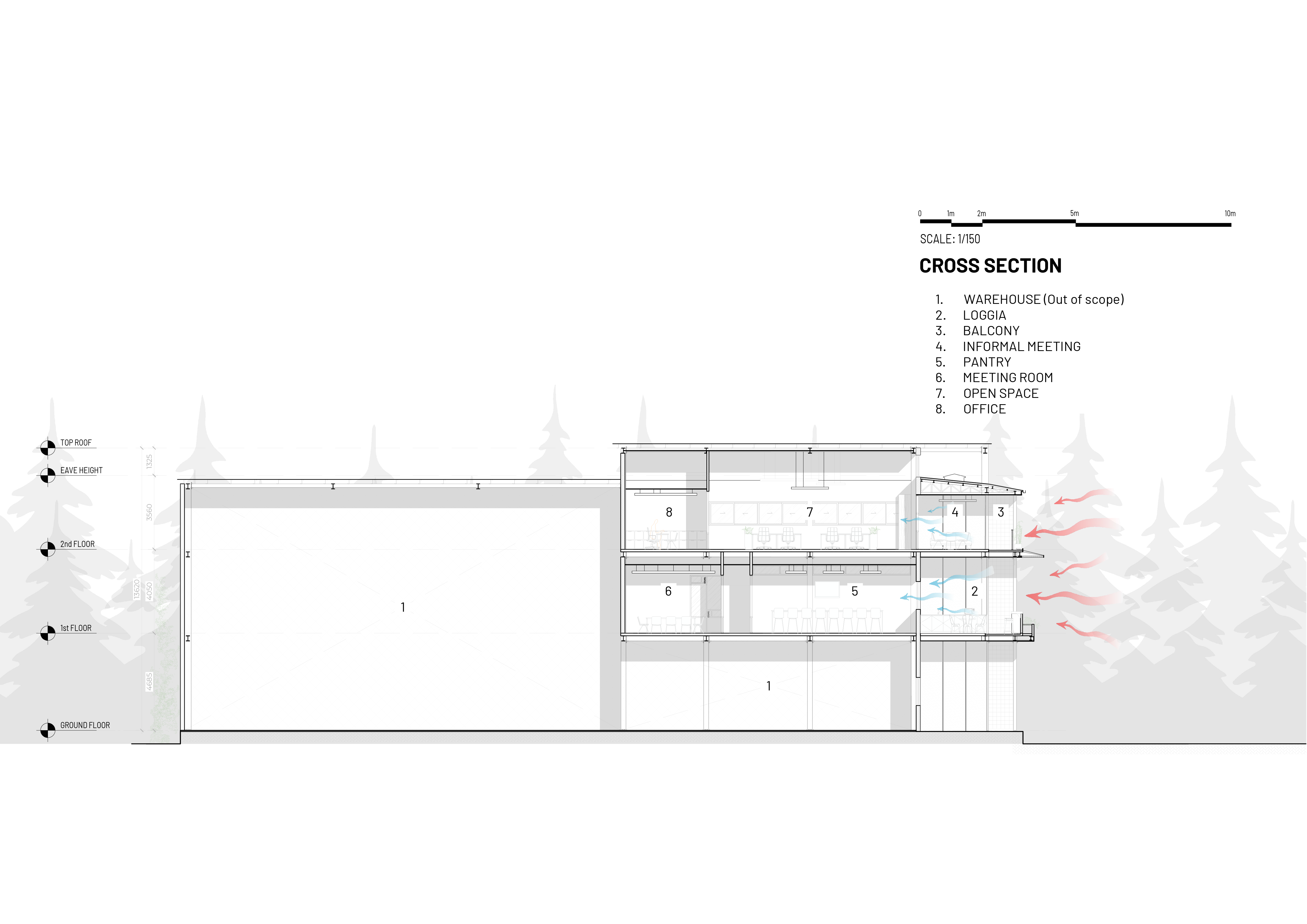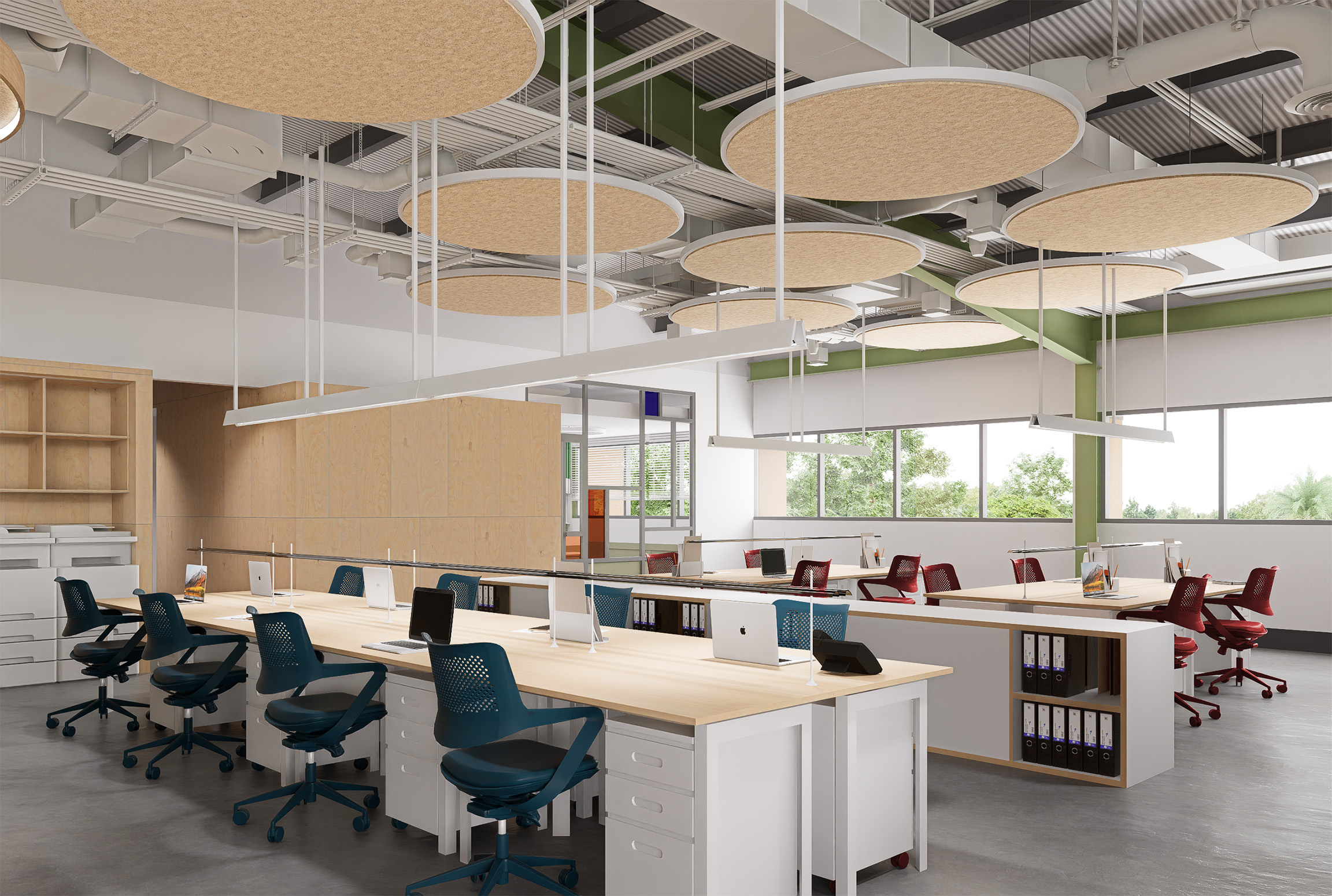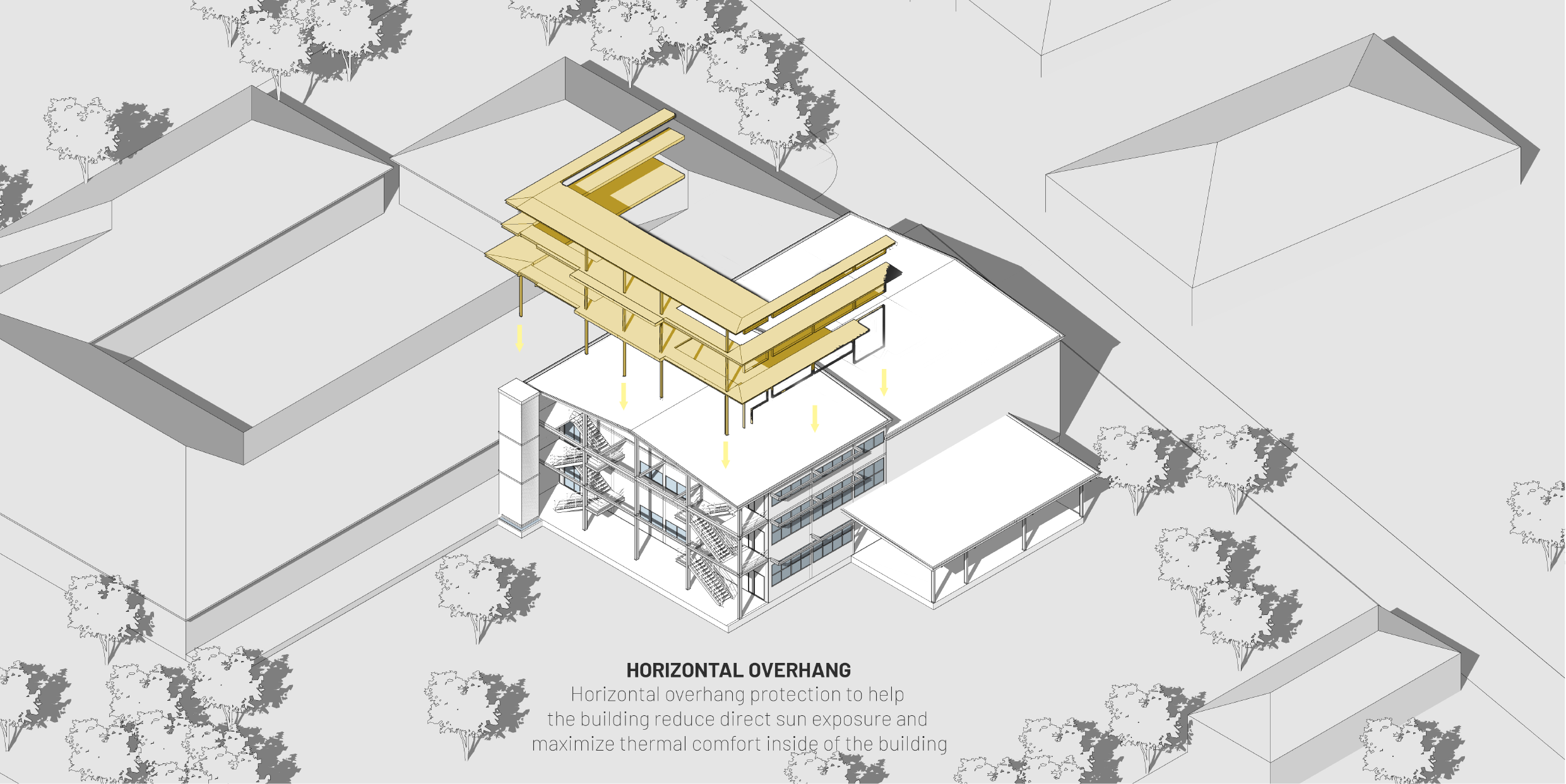 On the west façade, T3 introduced outdoor corridors, a loggia adjacent to the pantry, and an informal meeting area overlooking the landscape. Bamboo louvers clad the whole façade, and extended roof overhangs provide shade and protection from monsoon rains. The south façade was clad entirely in bamboo poles to improve thermal comfort and enhance the building’s appearance. Interior spaces were designed for comfort and individuality, using warm tones and natural materials like plywood, wood, and bamboo. The result blends professionalism with a cozy, inviting atmosphere, leaving the client highly satisfied.