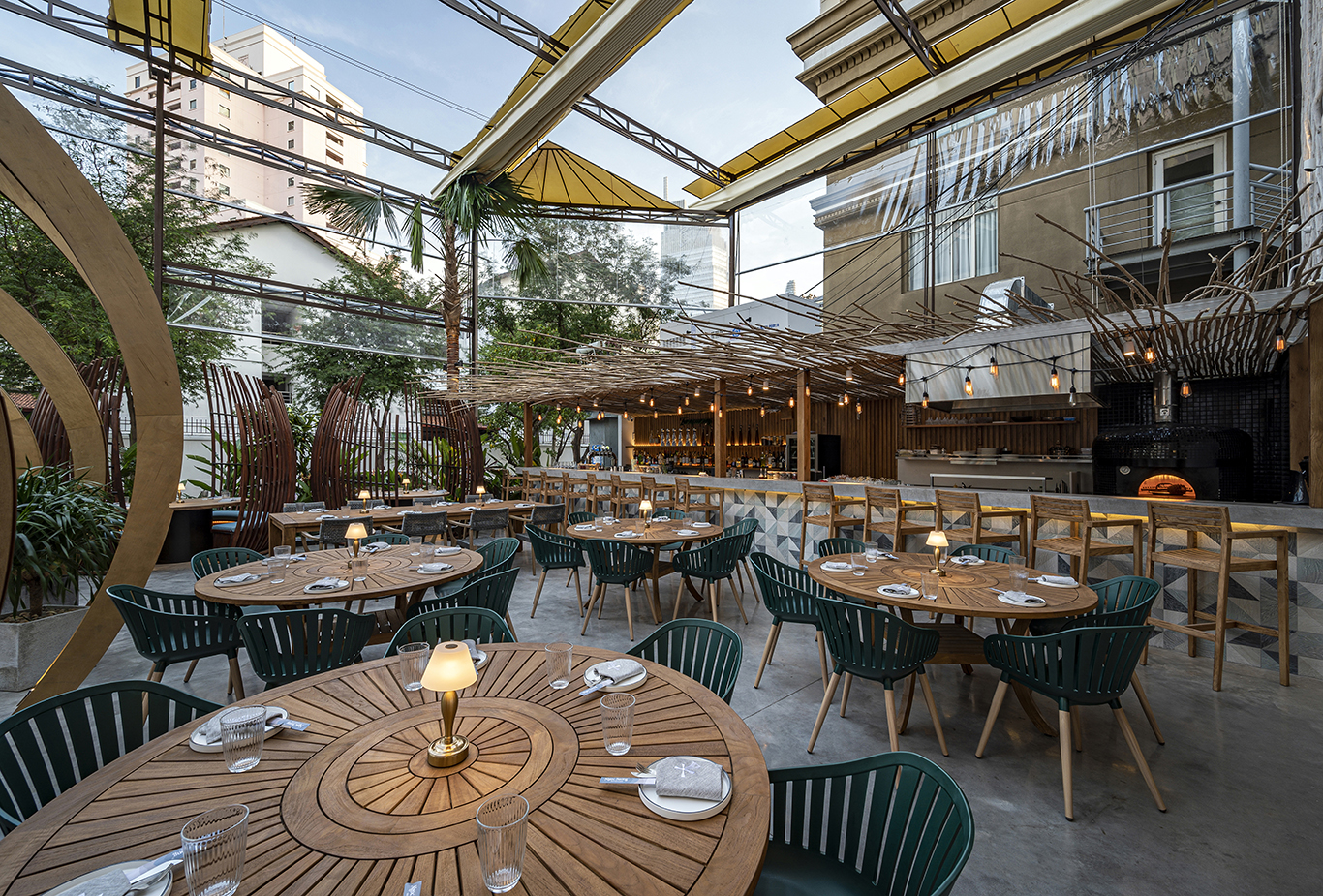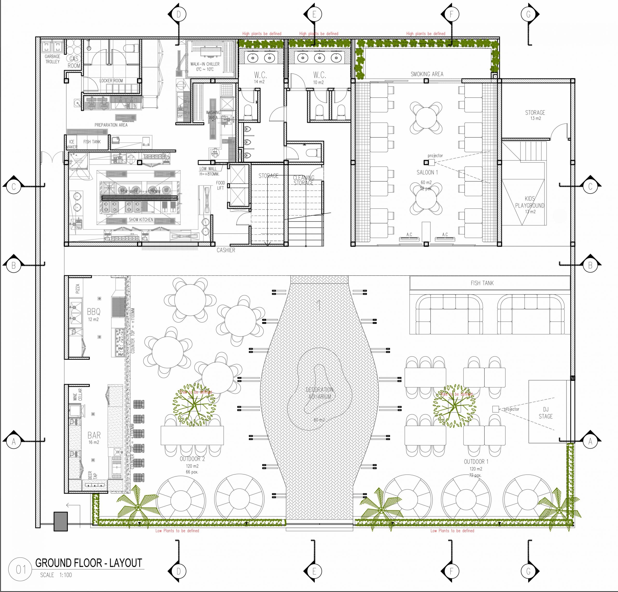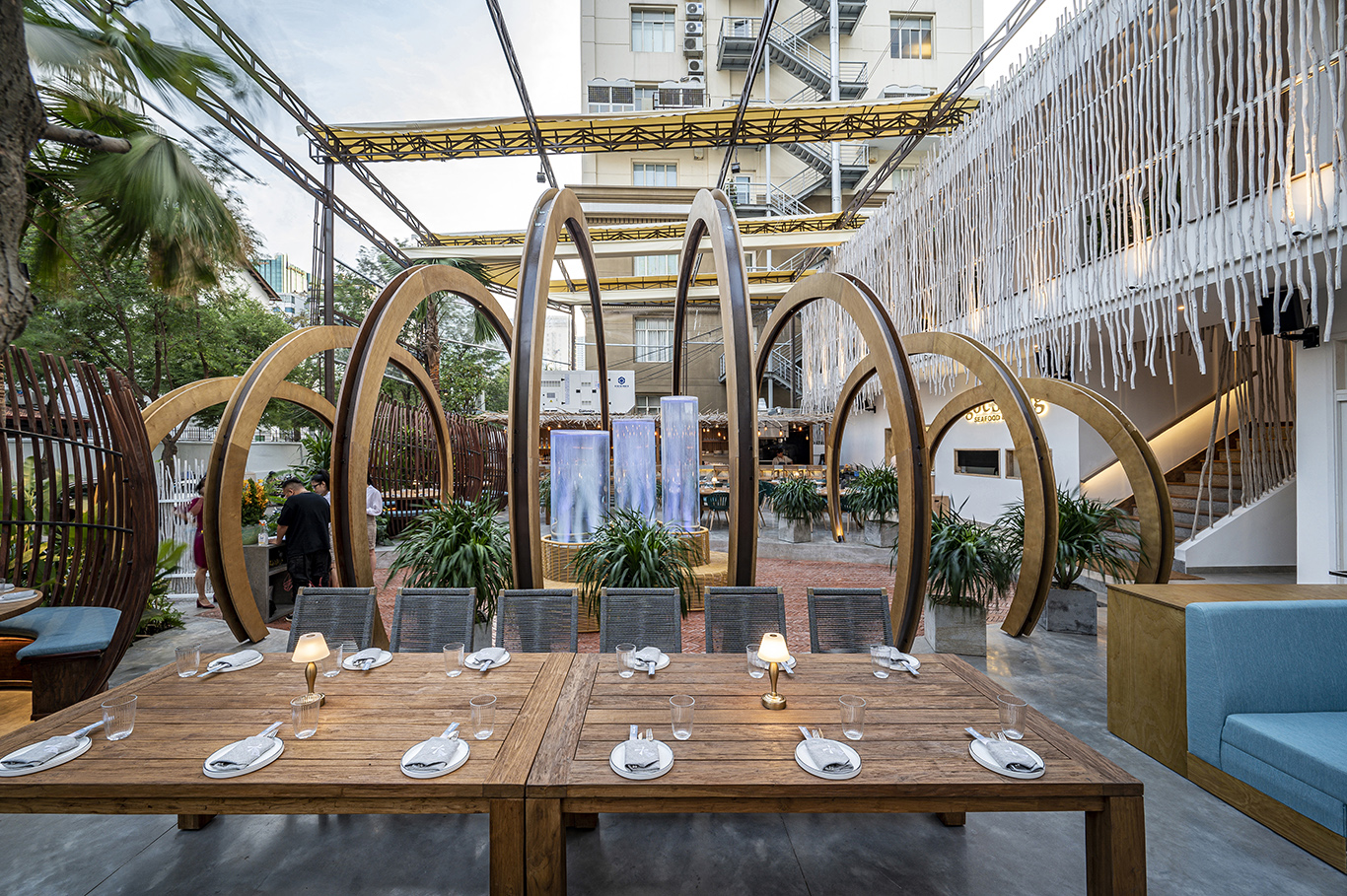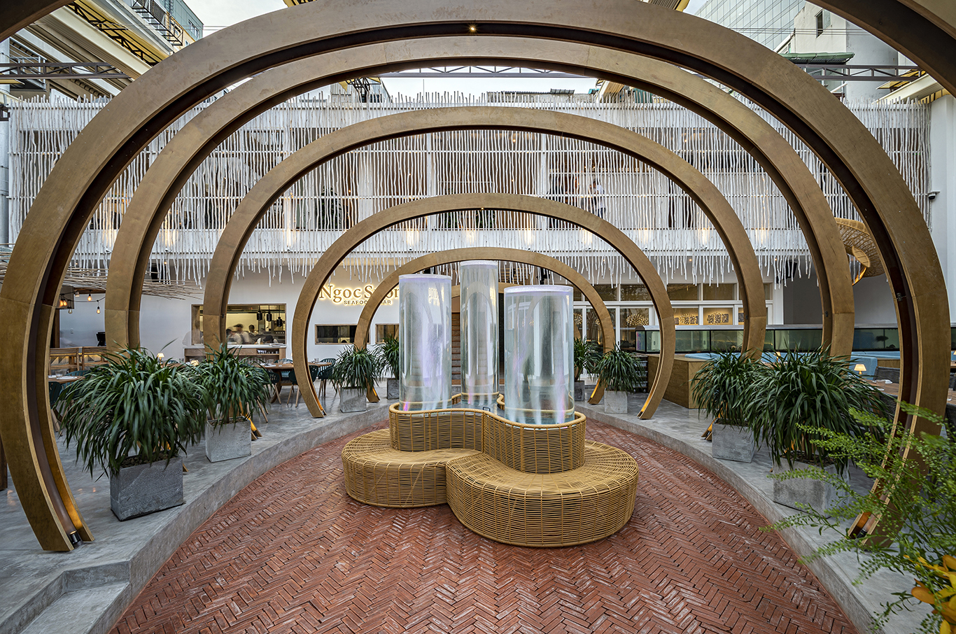The goal was to design a high-end restaurant that offers a unique festive dining experience featuring indoor and outdoor spaces with enough seating for over 200 guests. The top floor is a lounge that can be reserved for private parties. High-end doesn’t mean strict rules, the goal was to allow the guests to enjoy themselves while having fine dining dishes.