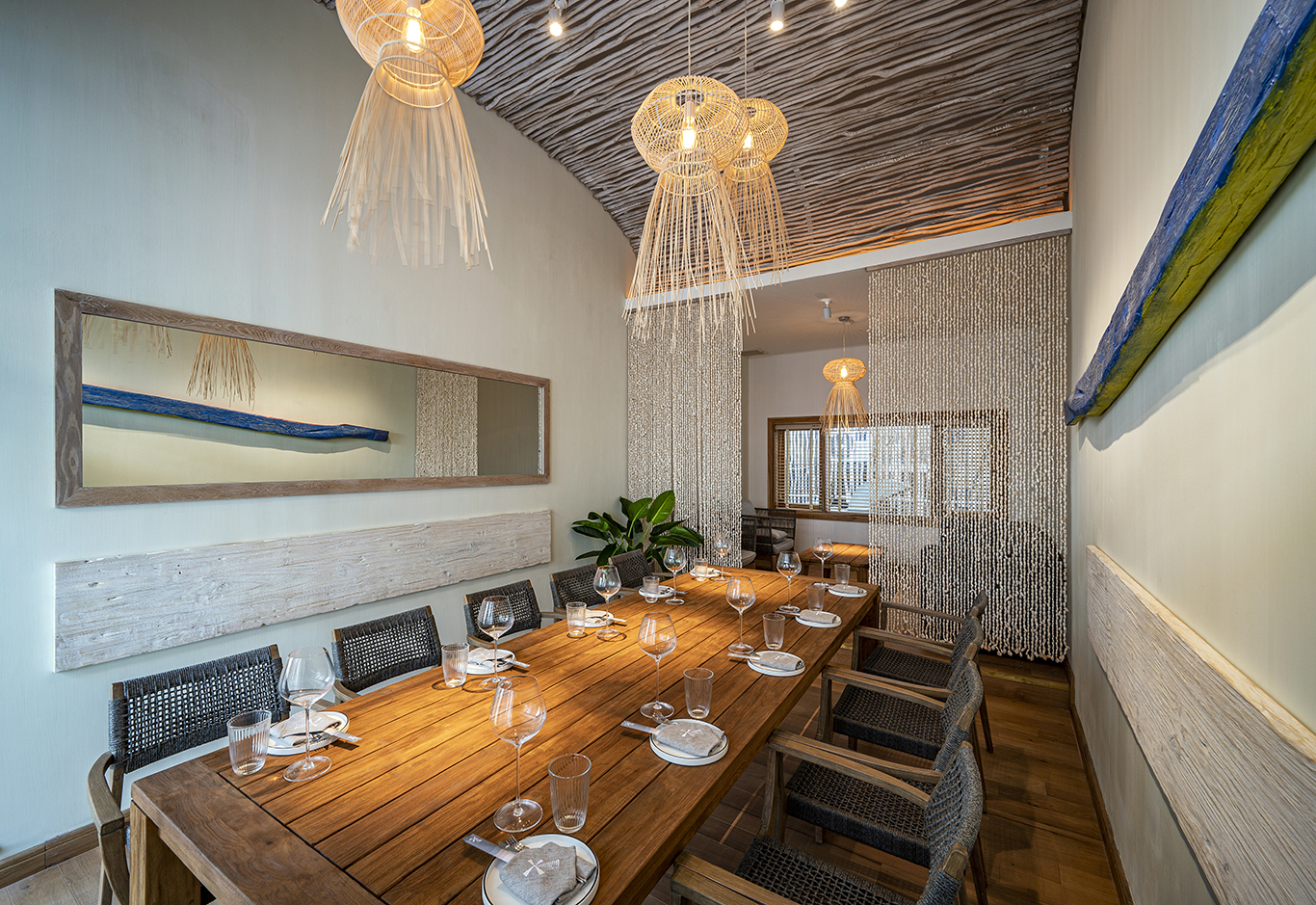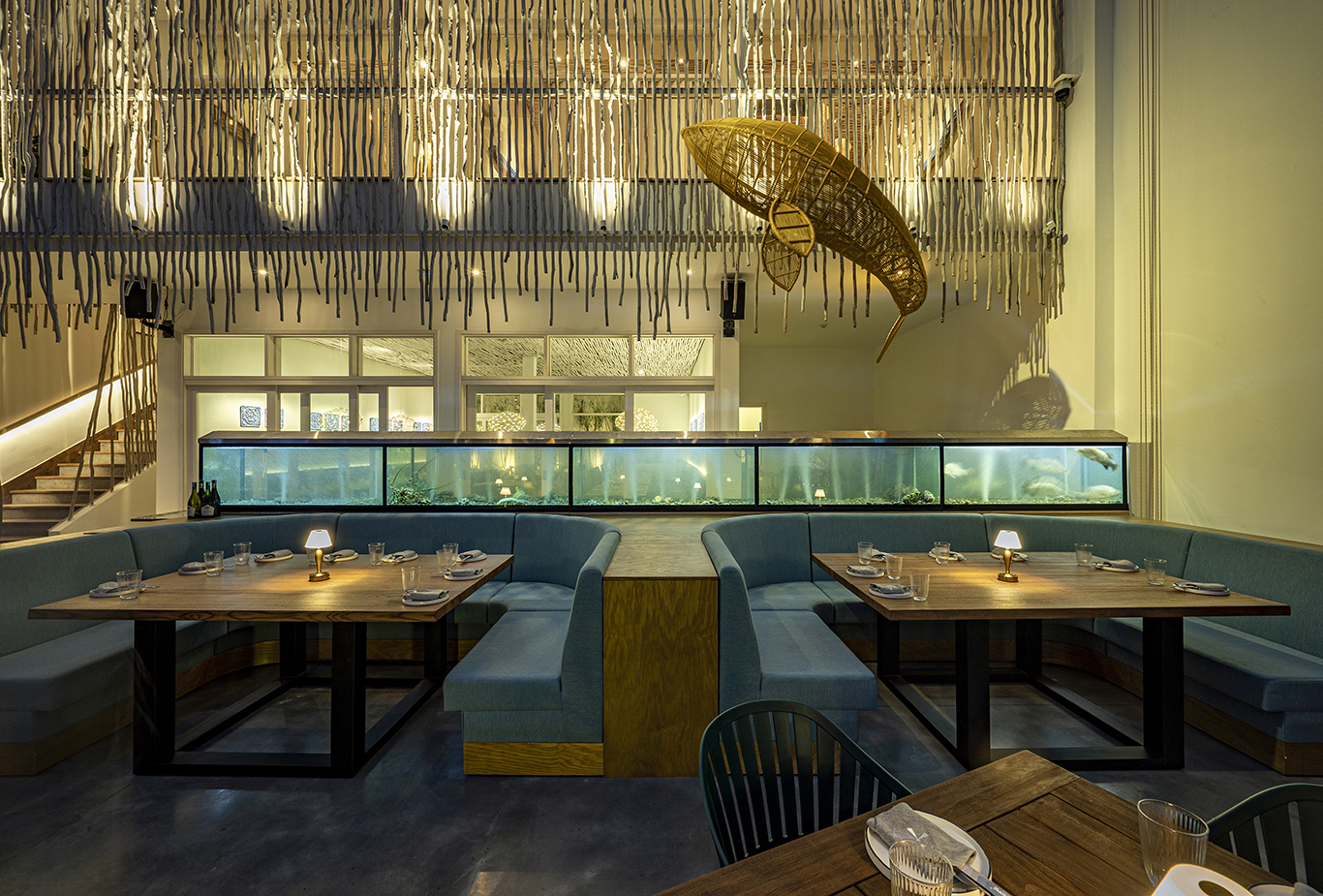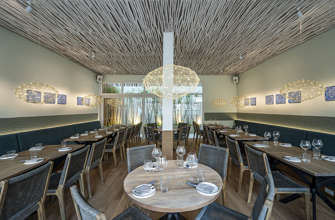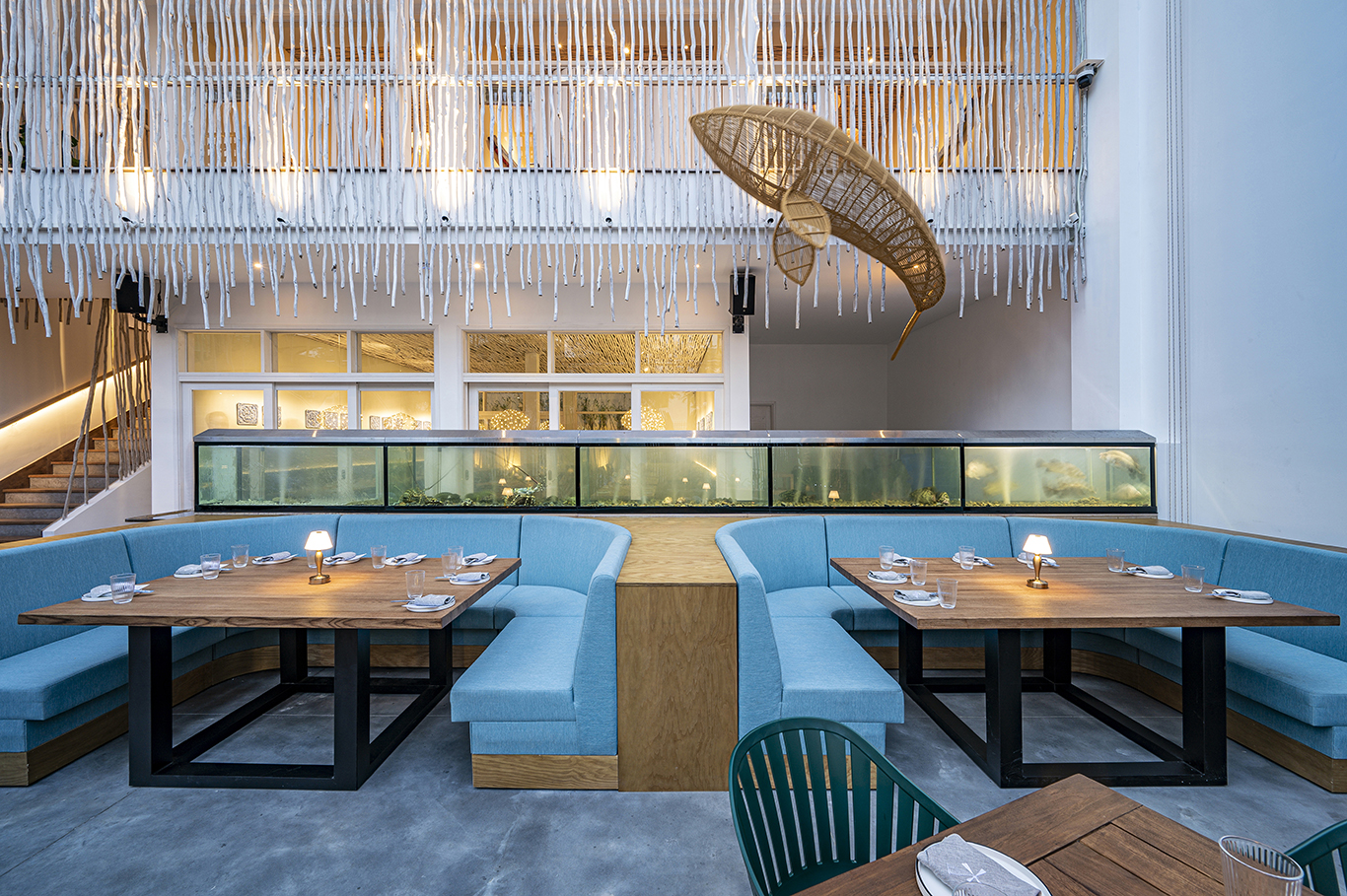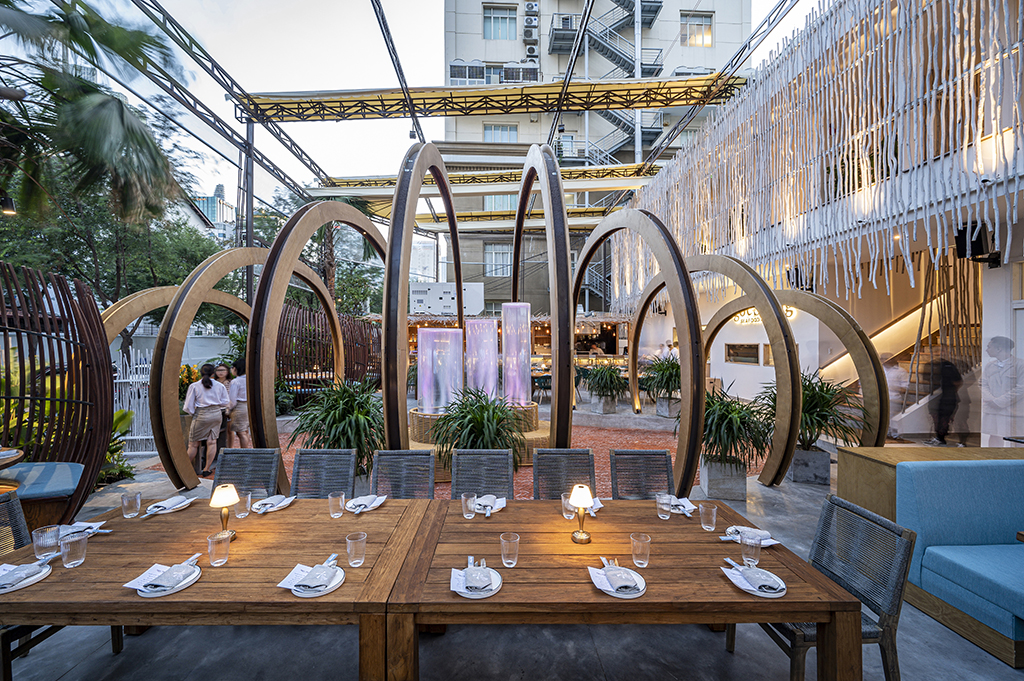 In addition, the restaurant was designed around a high-end sound system, strategic lighting and a layout that allows guests to be in full immersion into the culinary experience proposed by Nguoc Suong and his awarded Korean chief: opened-kitchen, “beach” bar, labo, wine & cheese bar, fish tanks…
