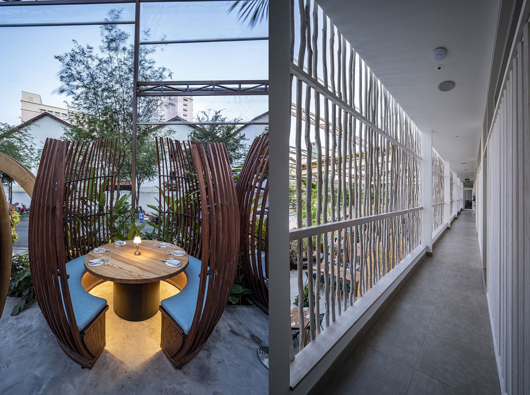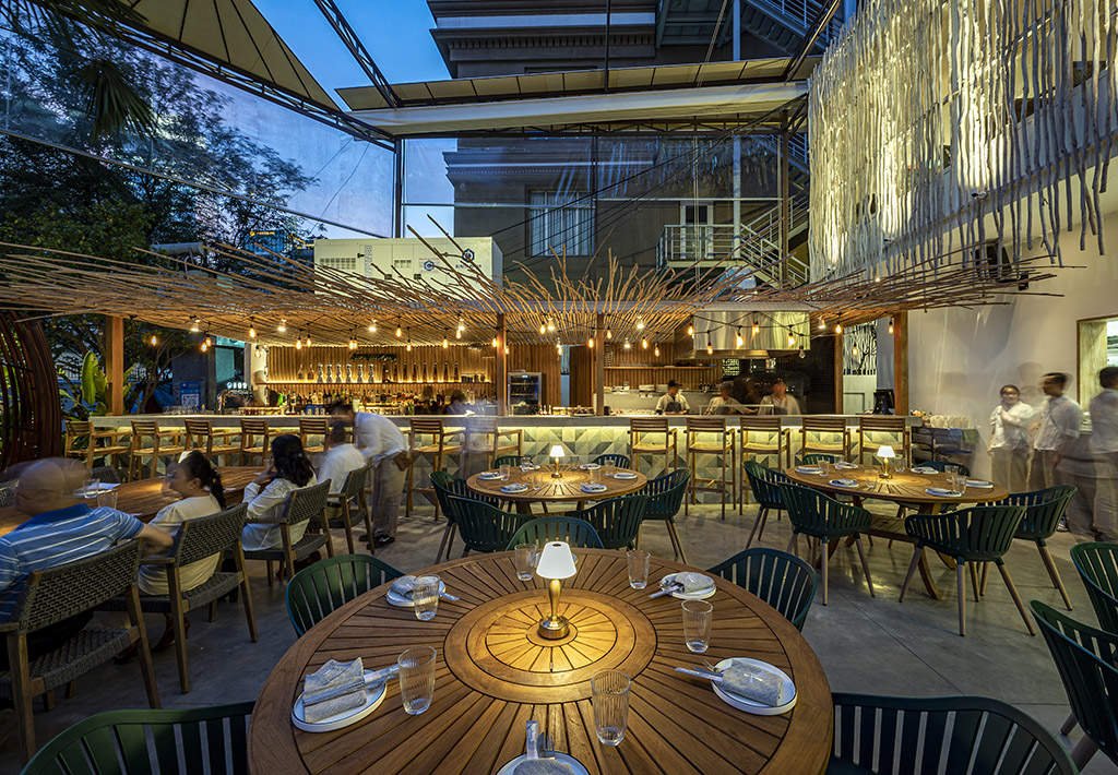 In addition, during the renovation process, T3 wanted to promote the use of natural materials like mangrove wood (used for the double skin facade and fence), bamboo (used for bar ceiling, to improve sun protection), timber from FSC forest (used for some partitions and most of the loose furniture), bricks, and to limit the air-conditioning use through natural cross-ventilation. T3 Team even recycled fishing materials : old wood reminiscent of the colors of typical Vietnamese boats, chairs made from the plastic of recycled fishing nets… !