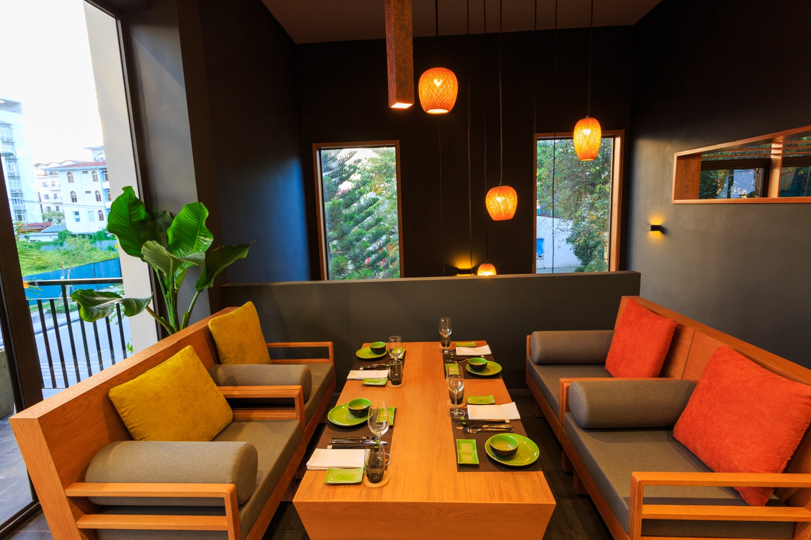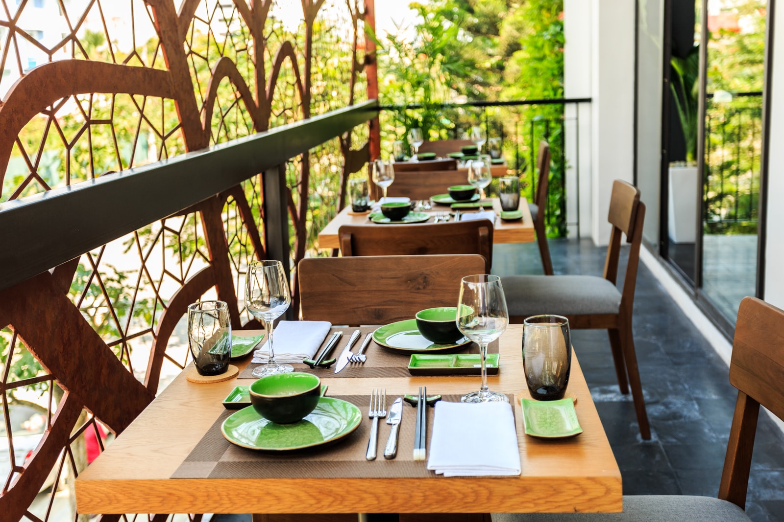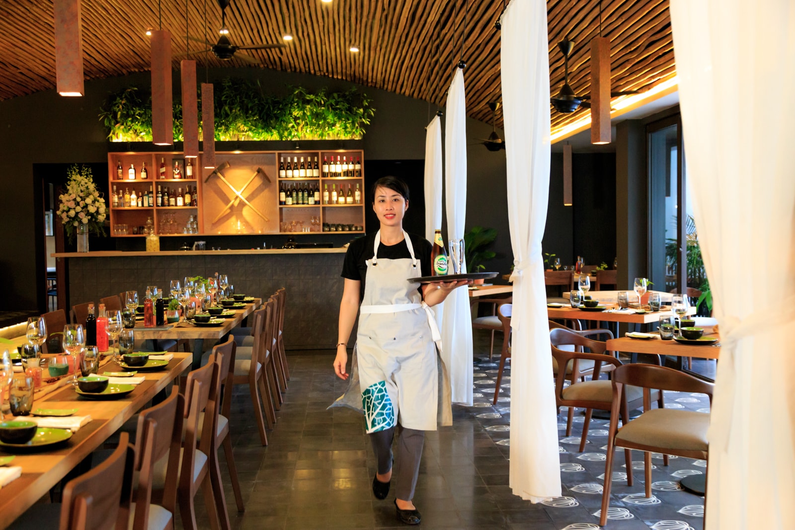 T3 team designed Spice Viet Restaurant in order to keep an original wooden ceiling in line with the “organic” and ecological concept. But one of the goal was also to limit the ceiling height, as to reduce the existing volume of the roof and avoid air conditionning a huge volume. T3 also created balconies and openable windows as to promote natural ventilation during the cool and rainy season. In that case, no need AC at all!