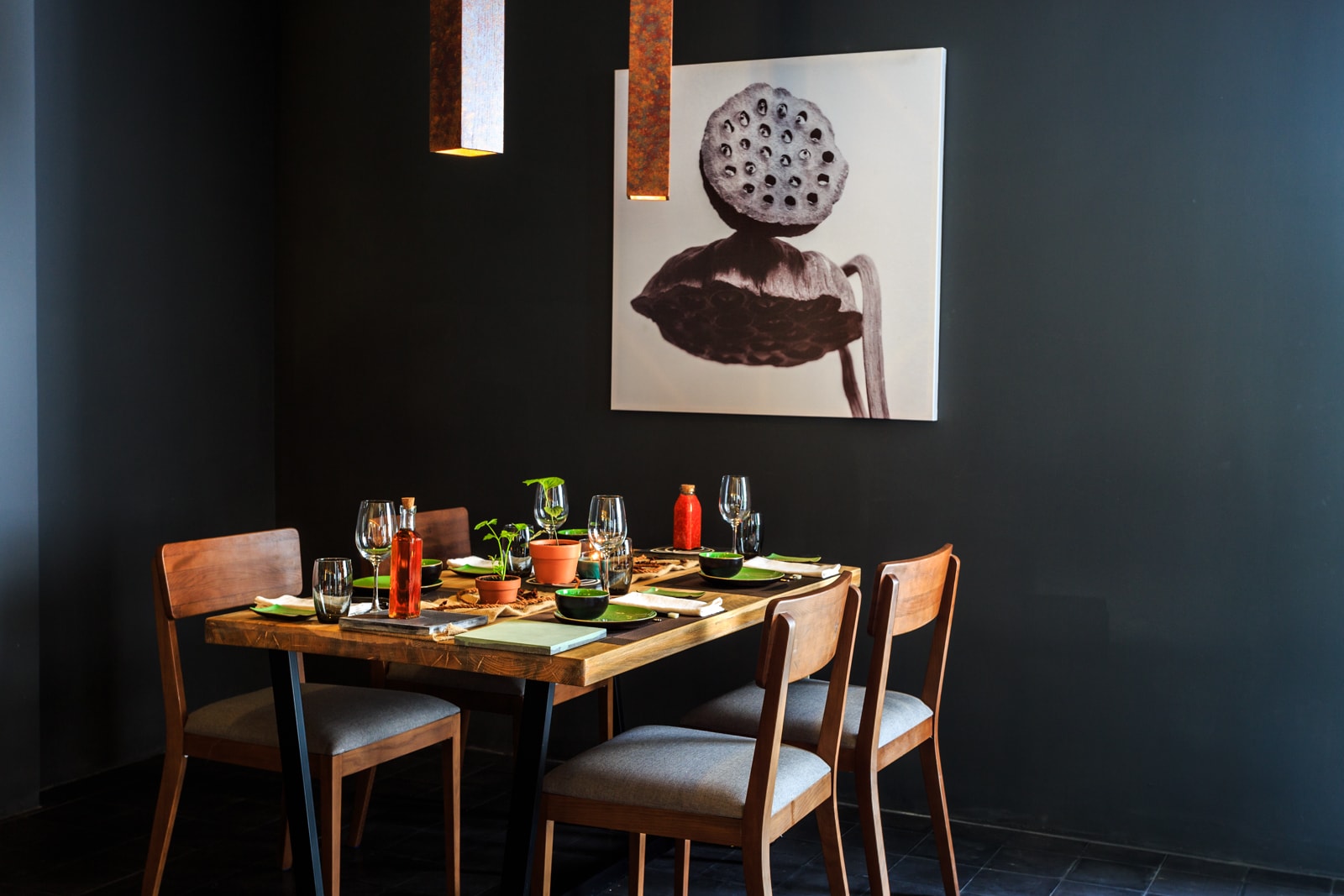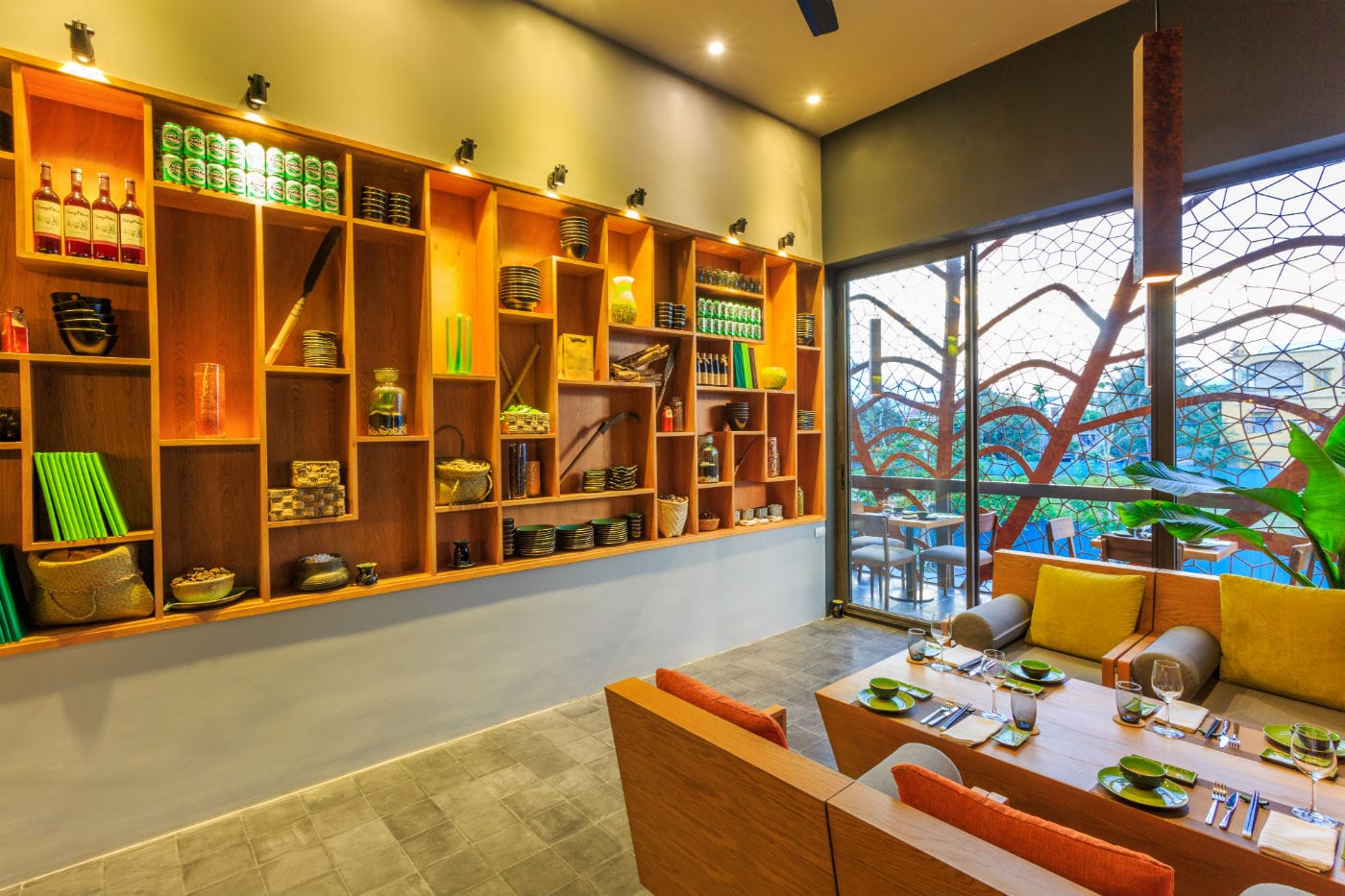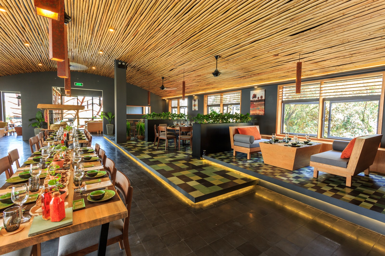 T3 was selected by TMG to define the new Brand Concept Design of “Spice Viet” Restaurant, a “farm-to-table”, casual dining restaurant using fresh and seasonal ingredients from local sources within a radius of just 30km of the restaurant. T3 defined the color Palette first (black and dark grey, natural greens, brown and some touch of orange and mustard yellow), then specified Materials and designed tailor made Furniture and Architectural elements (wooden furniture, corten steel panels, cement tiles, wooden sticks ceiling, tailor made lighting…). From a very “poor” ballroom, T3 turned the building in a contemporary green restaurant, with amazing corten style façade representing a specific leave used into the traditional Vietnamese Cuisine (La Lot leaf) as well as a green wall, both aesthetic and insulating the west façade from sun. T3 played with the leaf pattern to create some decorative walls and tailor made cement tiles. T3 created different ambiance into the restaurant, with 2 different terraces, a lounge room, a VIP room and the main room with different “corners”: lounge, long “signature” table, juice bar and more “privacy” for small groups… The restaurant, with windows located on 3 facades is mainly naturally ventilated (+ few ceiling fans) as to save energy as much as possible.