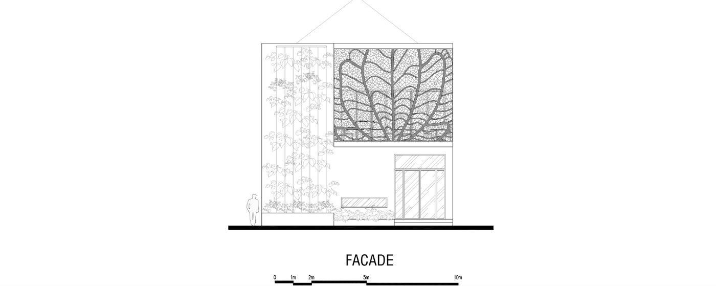 The exiting building was a hugly ball room with a very poor facade. T3 proposed to renovate completly the facade, bringing the brand pattern of the restaurant, a “la lot” leaf, as the main signage of the restaurant from the street. At the same time, this laser cutting panel is used as a sun protection for the building, filtering a part of the solar radiation from the west, balcony being itself a very efficient sun protection for the Ground floor area.