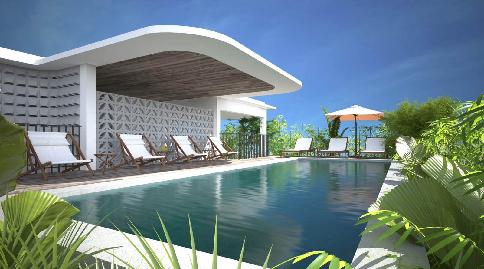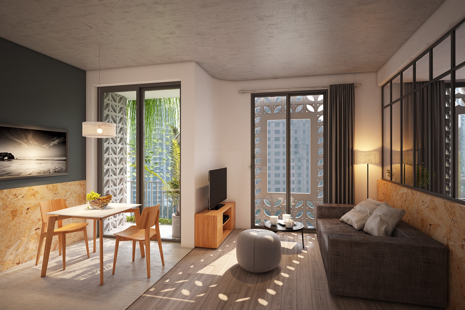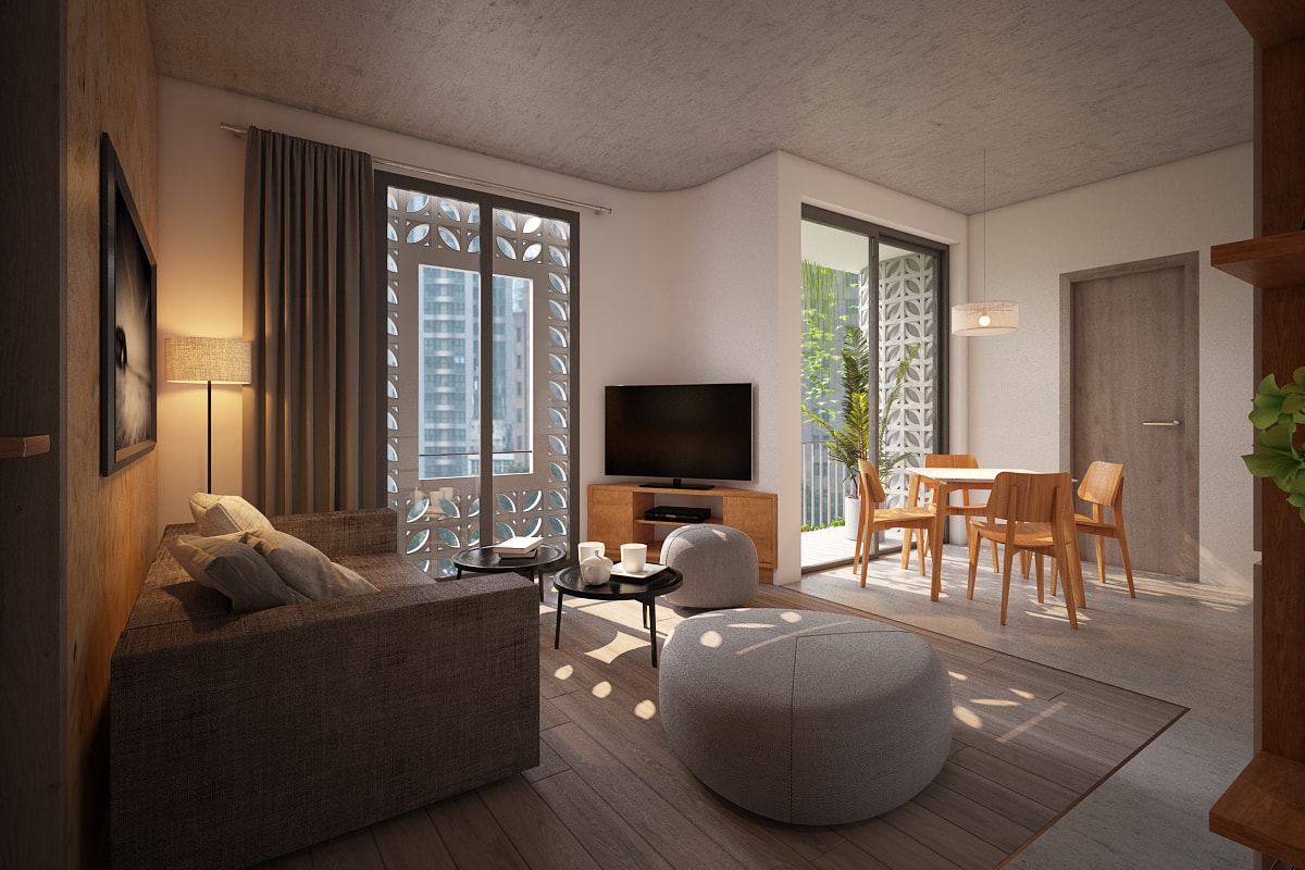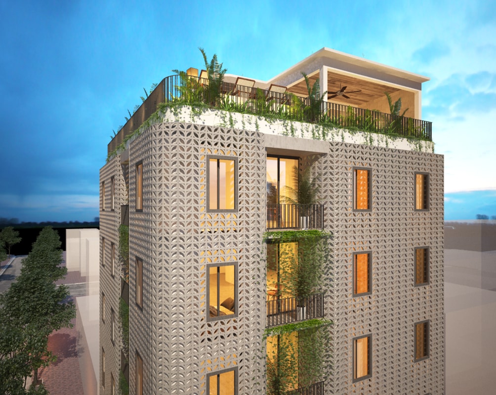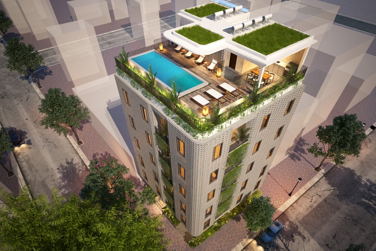 A Vietnamese Client asks for T3 to design a Service apartment Building in Danang. He wanted the expertise of T3 for the main Concept but also on all the Bioclimatic aspect: natural ventilation, sun protection, optimize the natural light, bring plants and trees (green roof, terraces, balconies…) and propose some additonnal equipments to improve energy saving (hot water solar panels mainly). Client being very opened-mind and having clear idea of what he wanted, T3 has designed the all layout and the original facade of the Building and all Interior Fit Out spread over 7 different levels (Semi-basement + Ground Floor with Reception, small Office and gym room + 10 apartments spread over 5 floors + 1 roof top ). The final result is a contemporary tropical design, with an original touch given by the ventilation concrete blocks… On the large roof top, T3 designed a nice infinity pool (facing the sea) surrounded by a wooden deck and tropical plants, as well as a common area to organize barbecue and small parties. All interior design have been made with locally sourced materials (cement tiles, OSB panels, ventilation concrete blocks…), but with a clear contemporary style, mix of minimalist and warm feeling. The result is a very unique Green Building, with high energy efficiency rate, in perfect line with Client’s expectations.