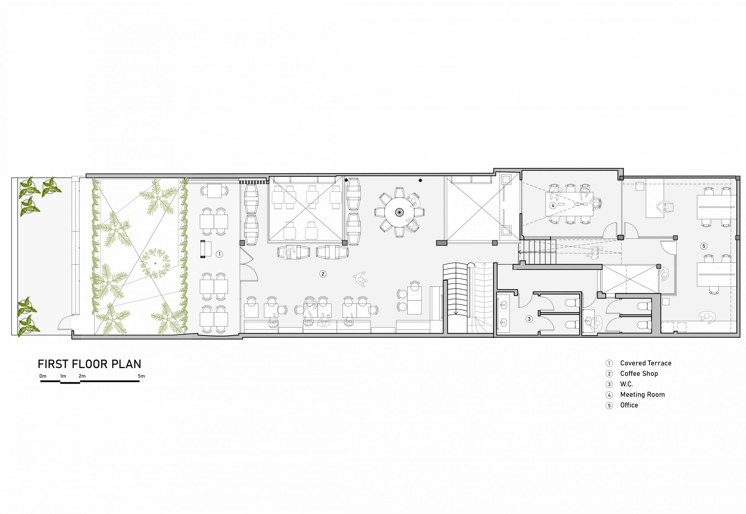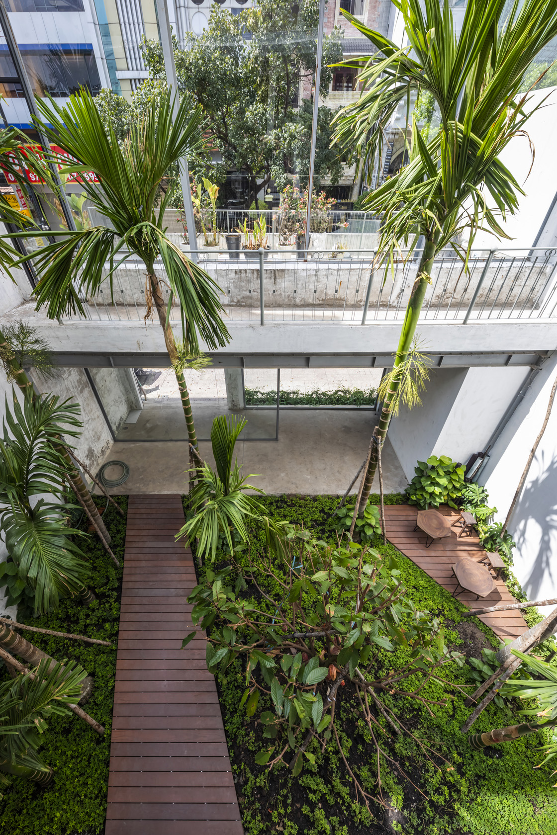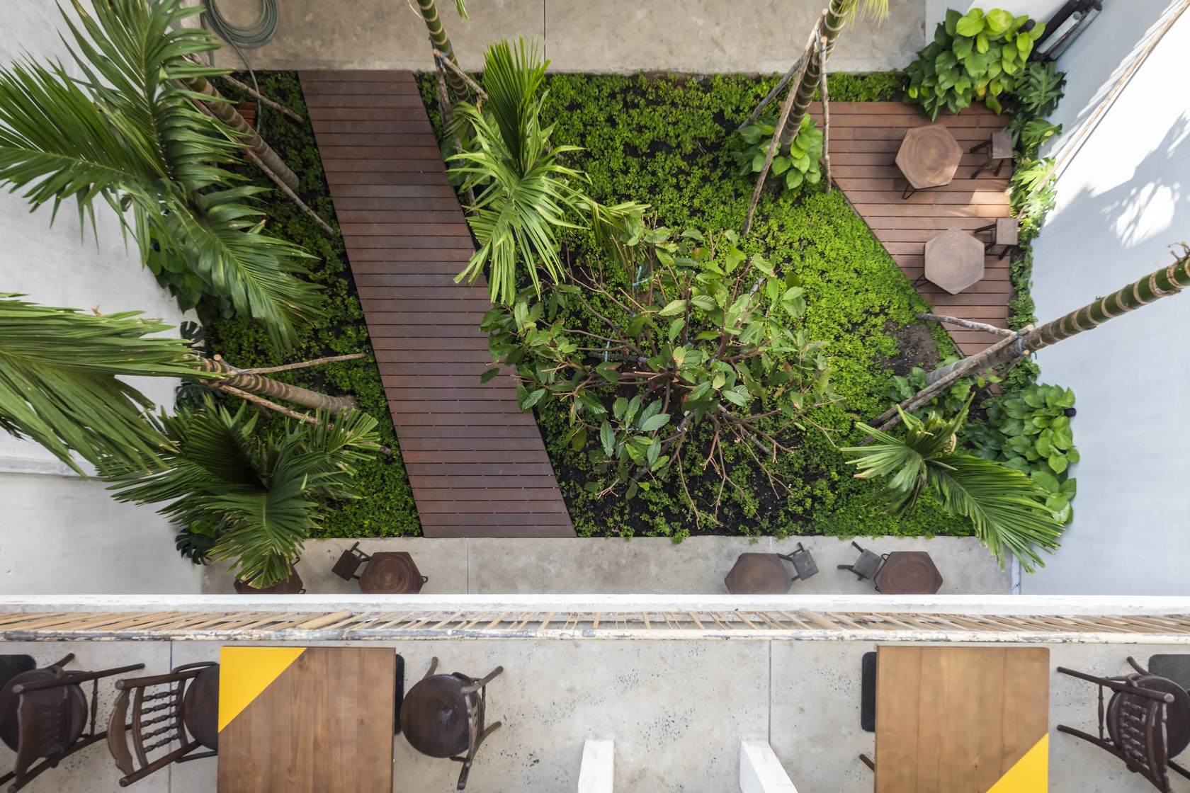 T3 did the choice to preserve a part of the existing street Facade, after removing all finishing, to create a kind of acoustic protection and offer a quiet garden and coffee shop, insulated from the street’s noise. The tropical garden was inspired by the plantations of the farmers of Ben Tre producing cocoa pods. We specified some typical palm trees from Mekong Delta as well as a very nice and productive Cocoa Tree, as a symbol. Some additional plants will cover the walls soon and bring freshness, without requiring any important maintenance; as T3 always consider to reduce water consumption. By creating a new garden, T3 idea was to bring back the natural and permeable soil to allow rainwater to go through it and minimize flooding. It was also a very good opportunity to bring natural light at both levels of the coffee shop, and a way to highlight the elegant modernist facade.