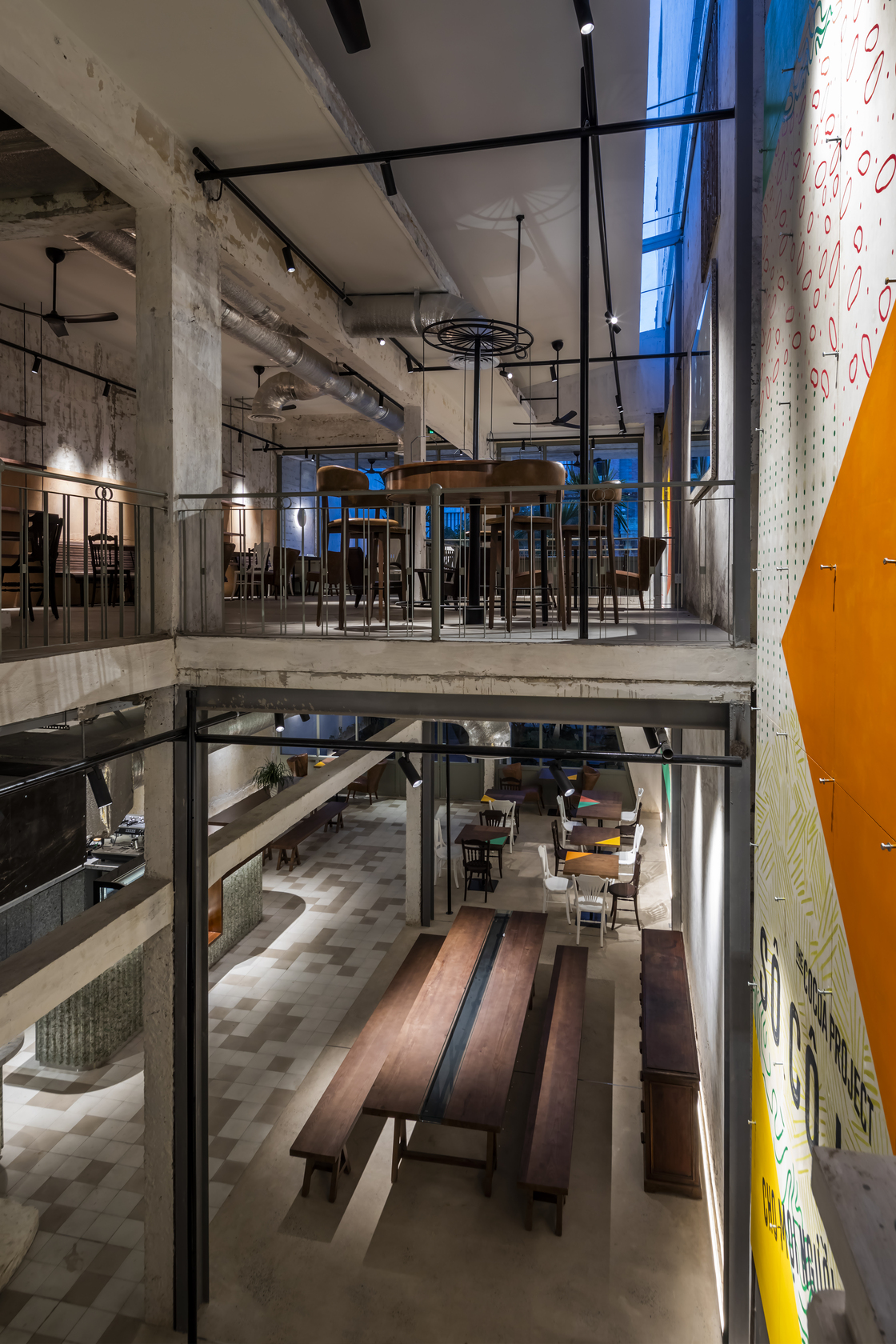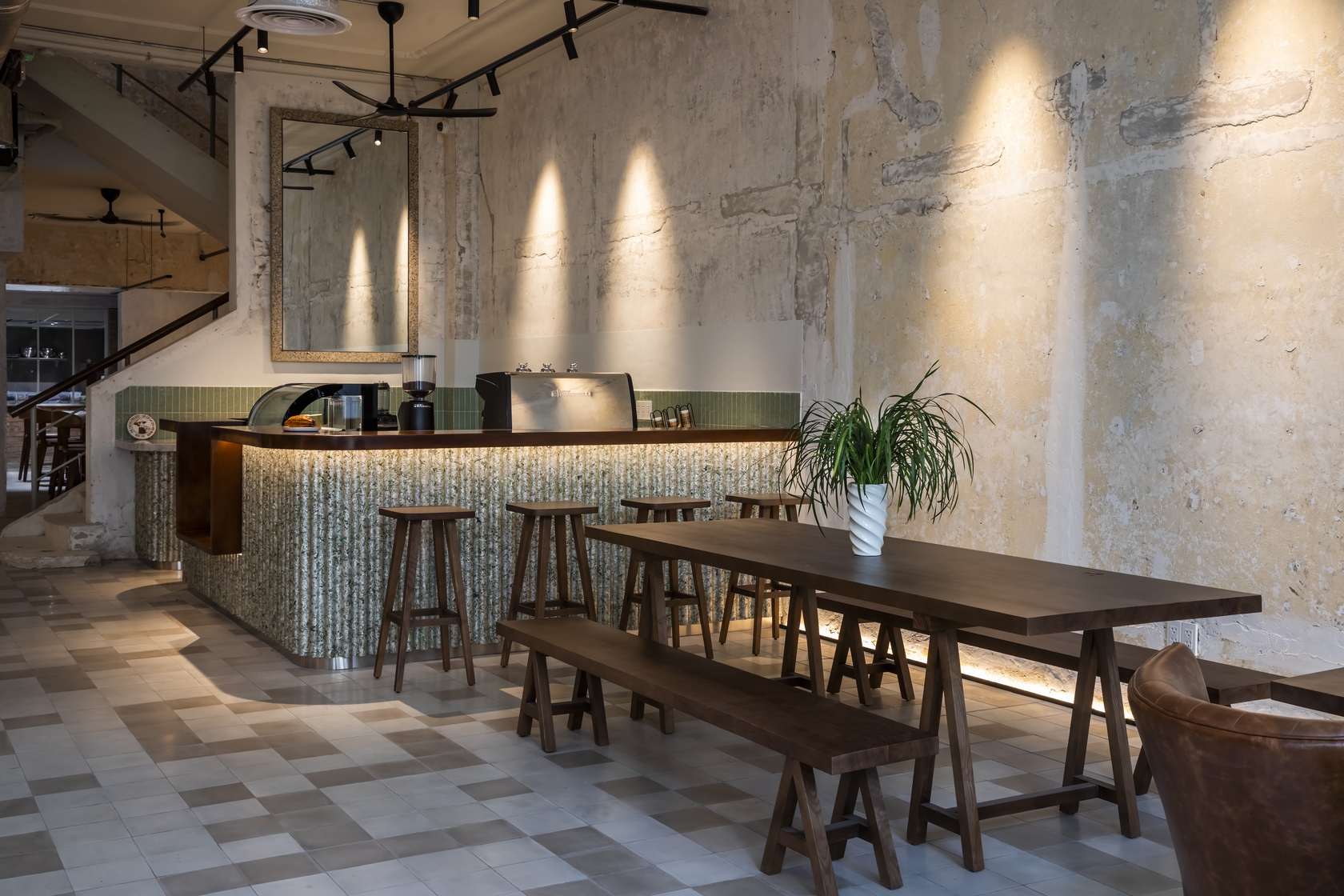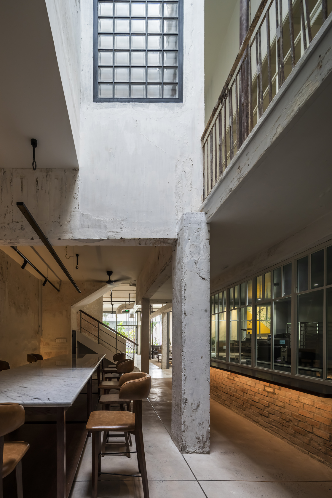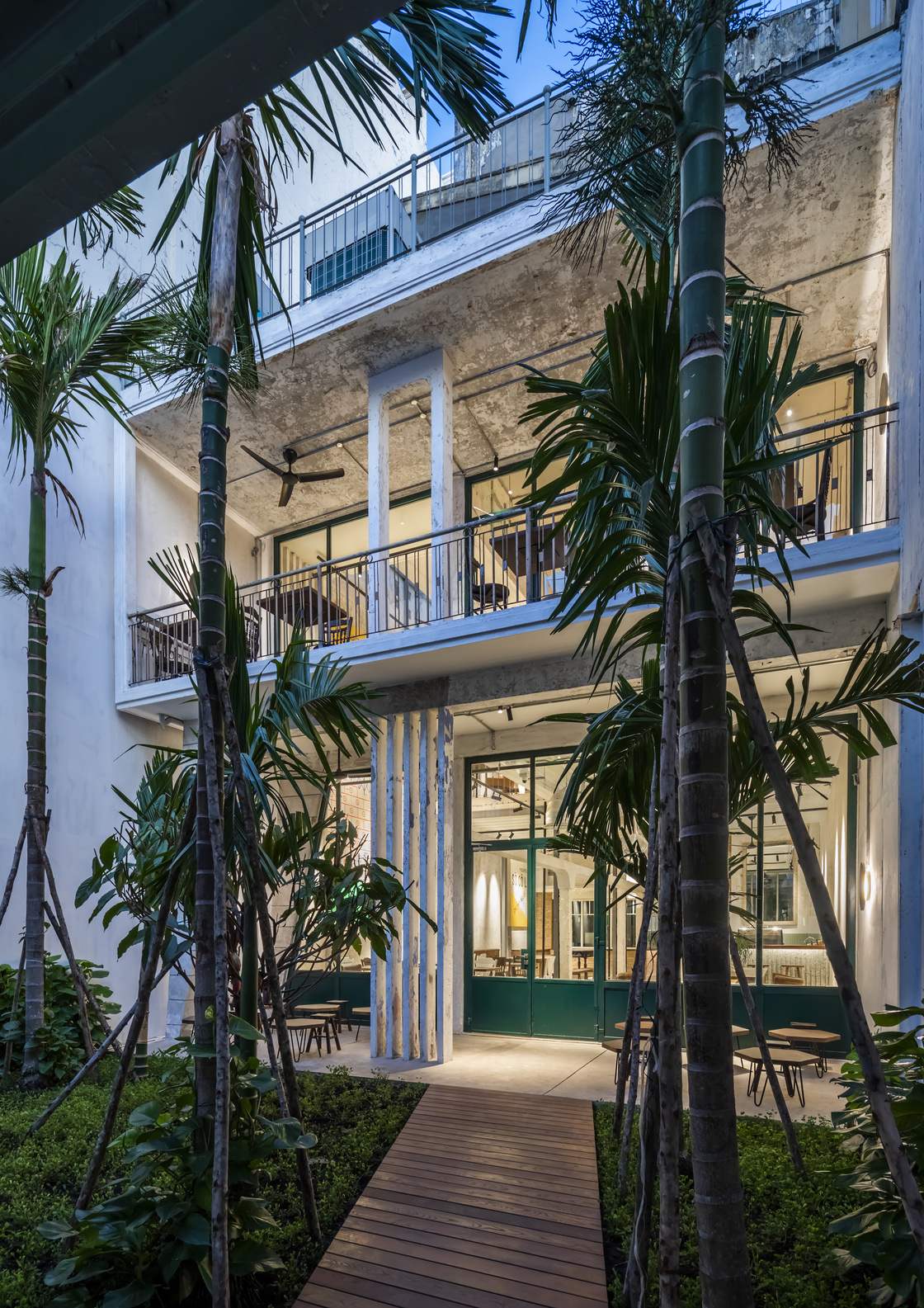 When T3 Team first visited the place, we saw a nice staircase in terrazzo, as well as some cornices on the ceiling, both typical from the modernist period. That’s why we recommended to select this location to the client to create their first Cocoa Project place, as the architectural heritage was in line with the authenticity we were all looking for. We proceeded step by step, removing layer after layer, discovering old handrails, vertical concrete louvers, old layers of lime painting. And we decided to preserve all to suggest the past and the history of Saigon.