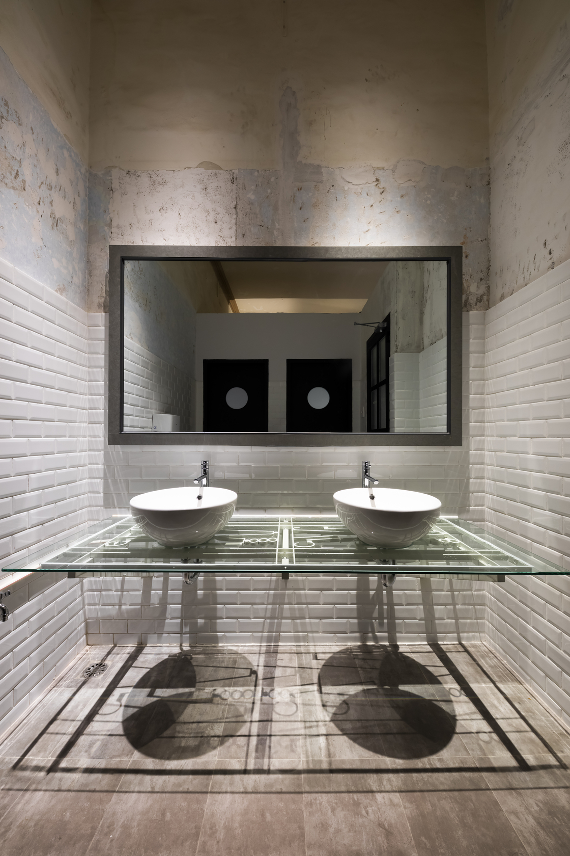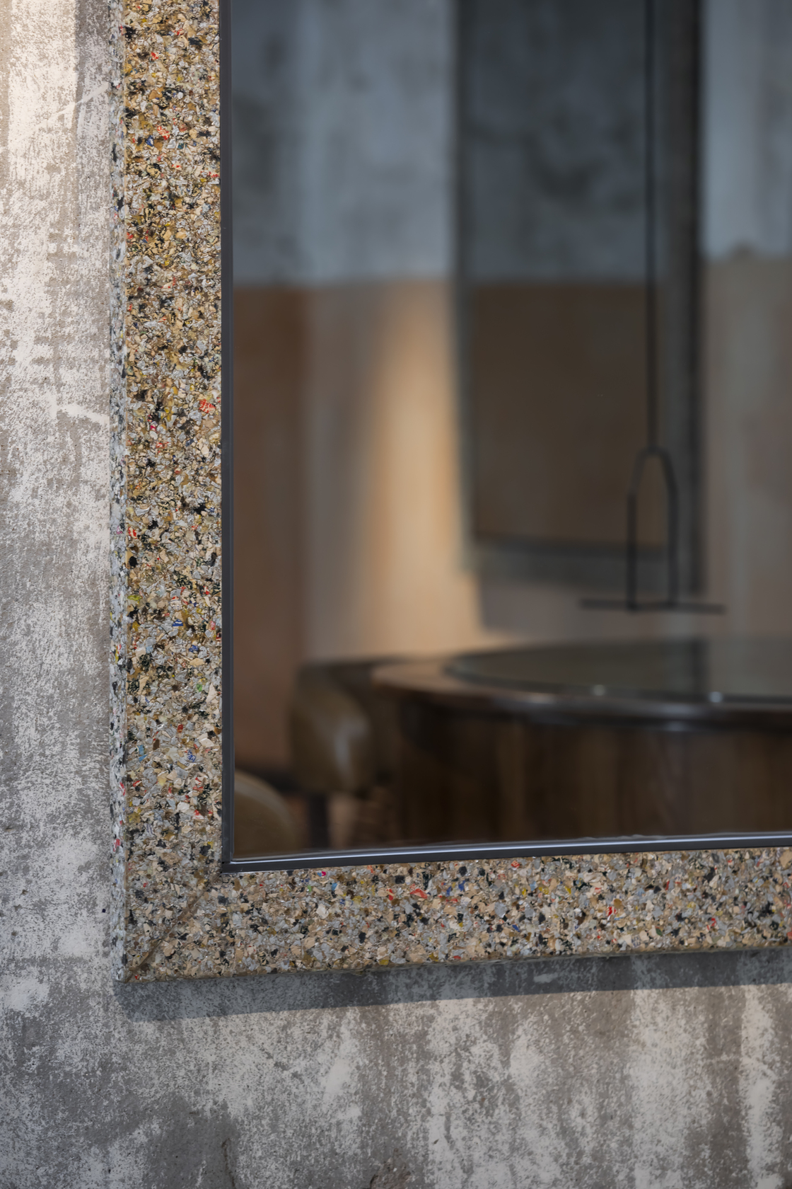 More generally, T3 intention was to make this project as sustainable as possible, first by preserving the main structure of the existing buildings (always better than demolishing and rebuild). Then, we have reduced the number of new materials as much as possible. All of them are sourced and produced in Vietnam, to avoid unnecessary transportation costs and pollution. Finally, T3 specified natural or low carbon materials as much as possible to ensure a proper air quality (zero chemical): non cooked local cement tiles, solid wood for all furniture, knowing that a large part are antic furniture, lime painting, etc. The bar counter and mirror frames have been tailor-made by T3, using materials composed by recycled tetra packs & plastic produced by our friends from Plastic People.